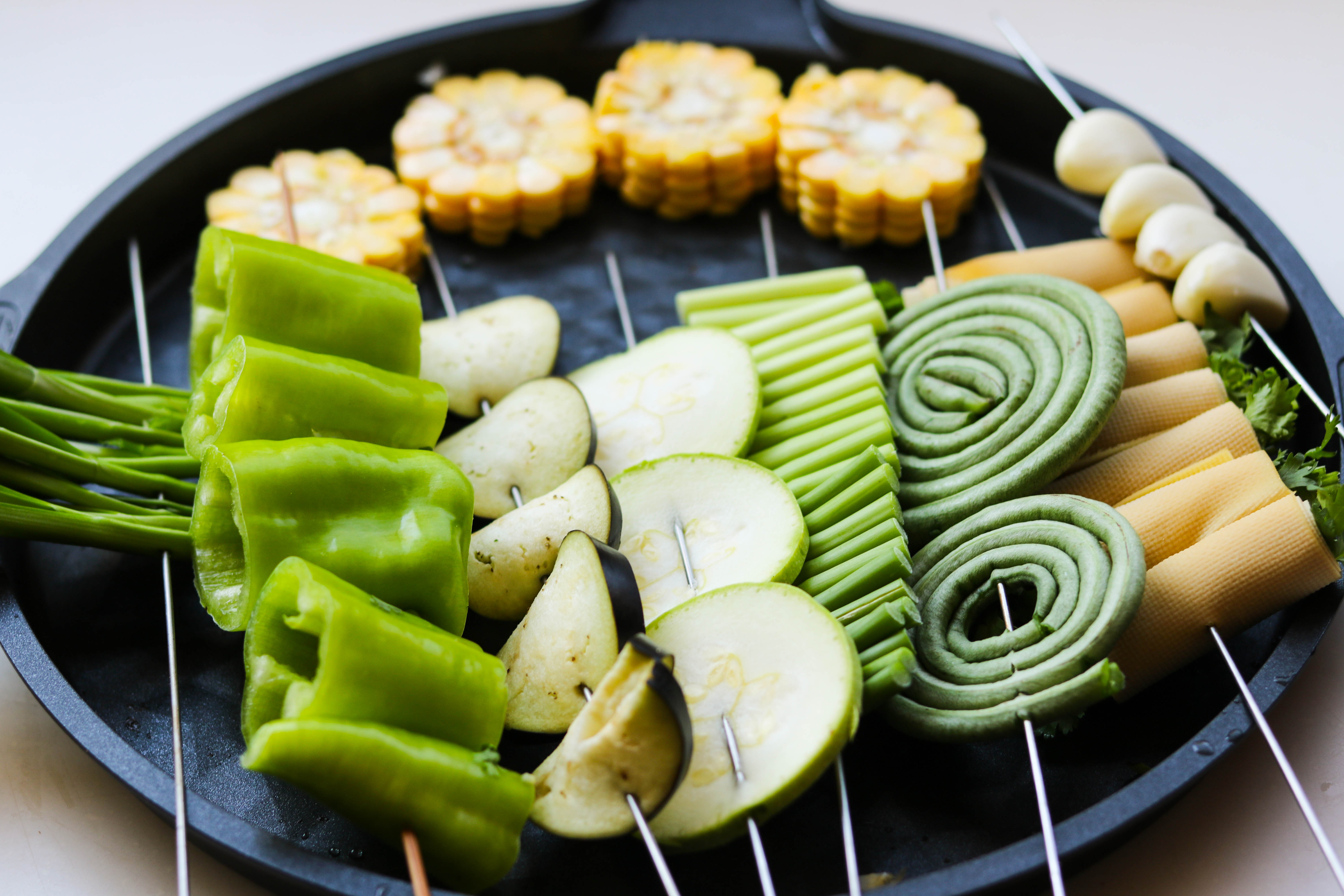 2、玉米切薄片,辣椒切段串起來(lái),西葫蘆和茄子切片串起來(lái),蒜薹切段串起來(lái),豇豆串成了大大卷的樣子也是很萌,豆腐皮里加上香菜和小蔥卷起來(lái)也串成串。