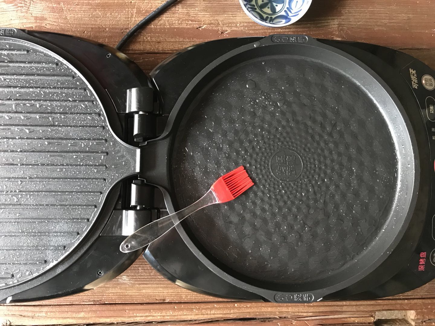 3、電餅鐺加熱后在其烤盤刷上薄薄的一層色拉油或玉米油
