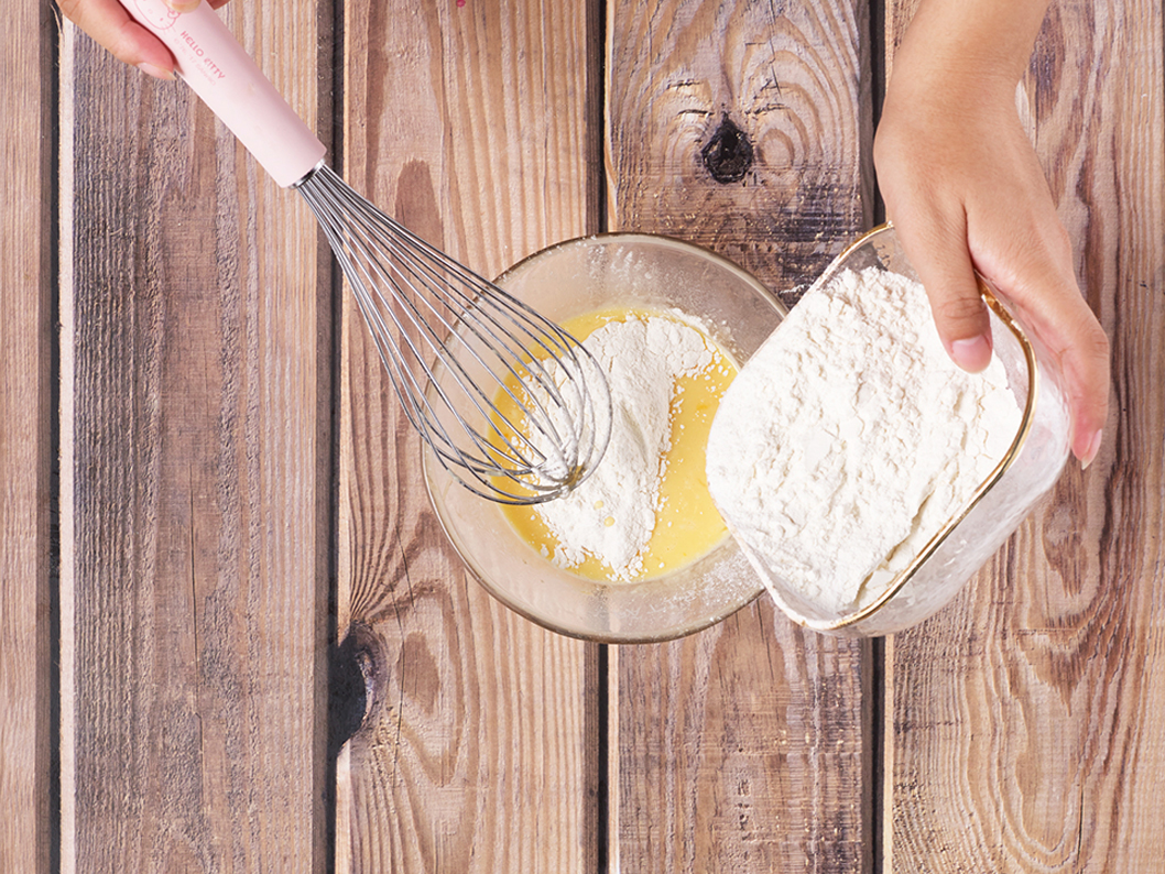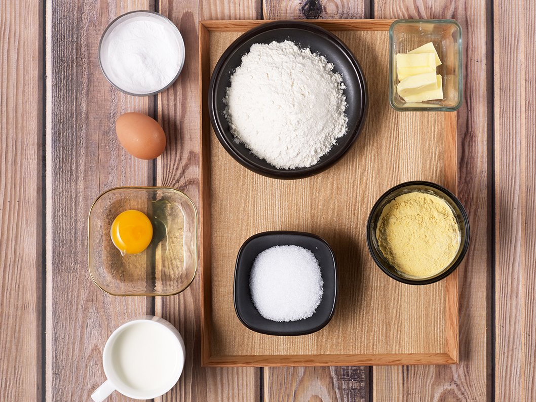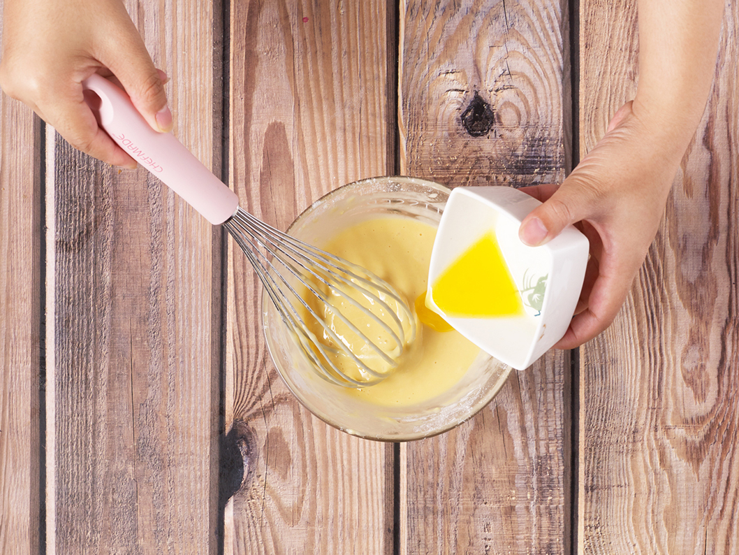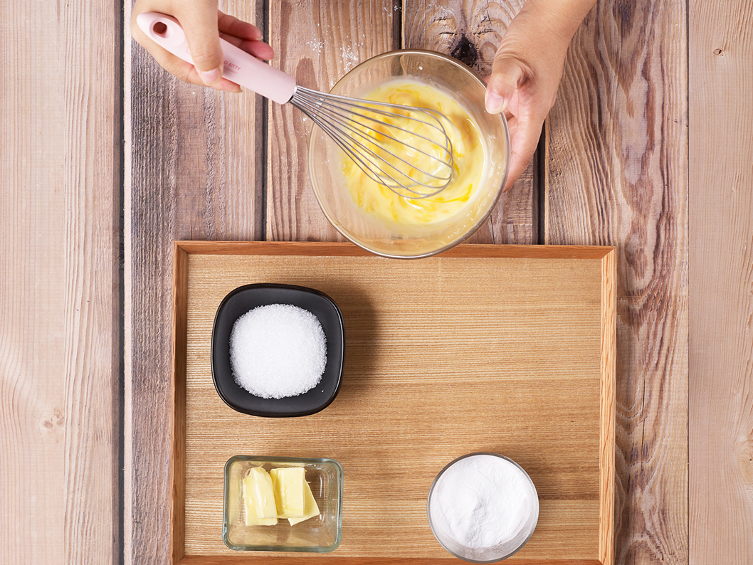 配料:雞蛋2個、木糖醇35g、液態(tài)黃油10g、純牛奶120mL