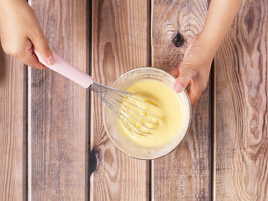 步驟: 1、取蛋黃兩枚加入木糖醇10g、牛奶120mL、液態(tài)黃油10g拌勻;