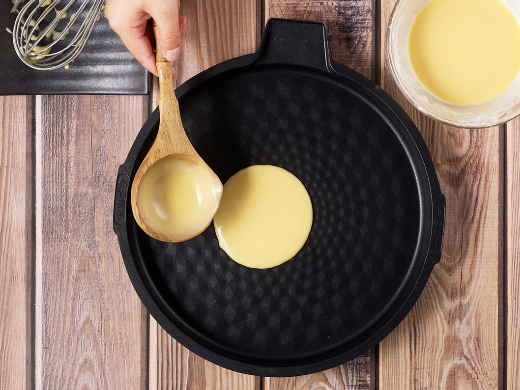 5、升降高度調(diào)節(jié)至15mm,選擇“雞蛋餅”功能,預(yù)熱后從烤盤中心倒入面糊攤平,待起泡泡后,用硅膠鏟翻面;