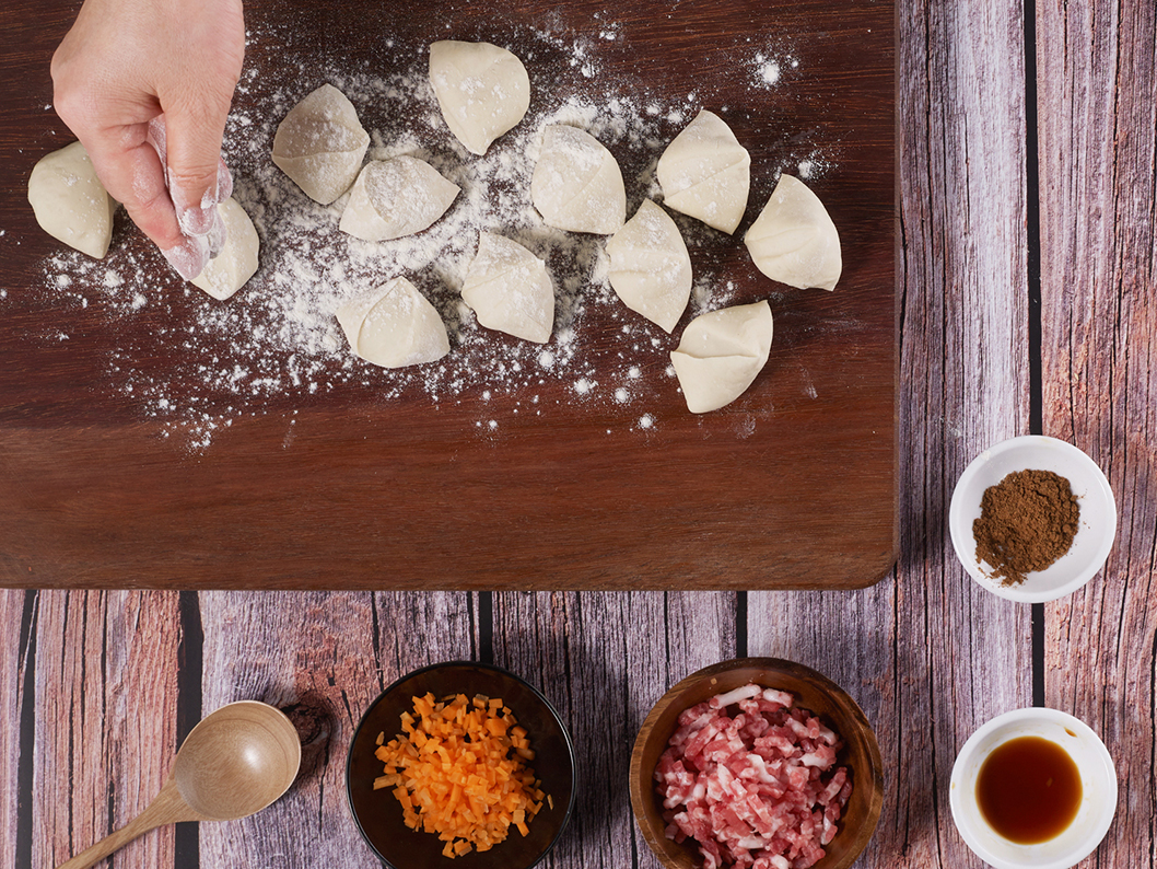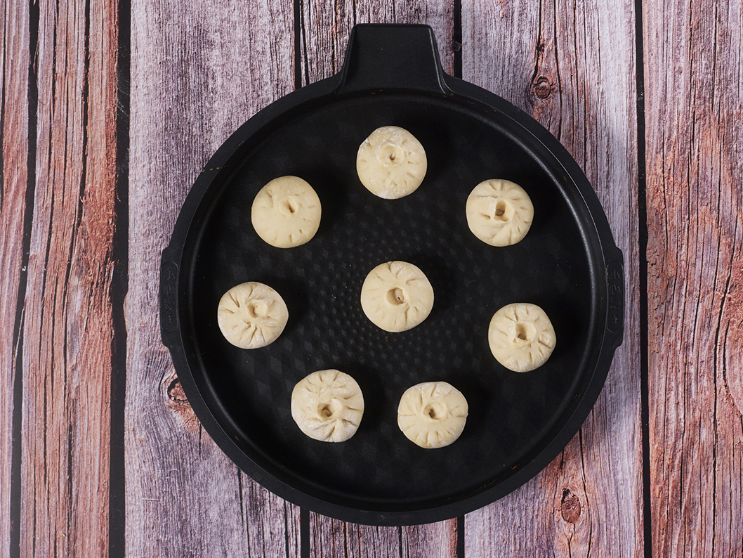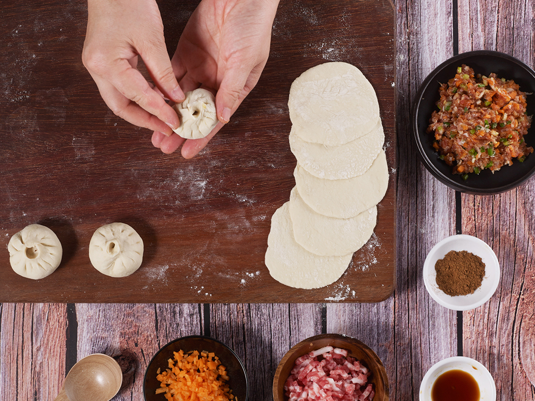 4、取餡放入面皮中央,捏成褶子,靜置20分鐘;