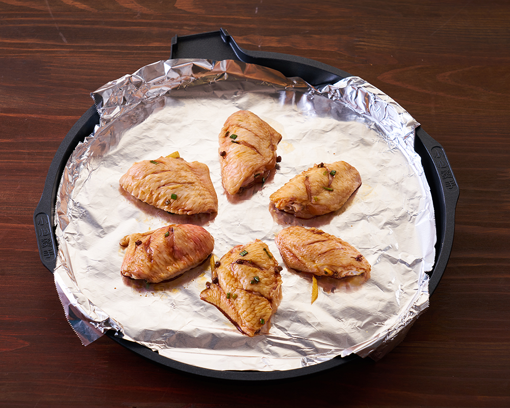 2、升降高度調節至25mm,選擇“雞翅”功能,烤盤刷適量食用油,預熱后,雞翅放入烤盤;