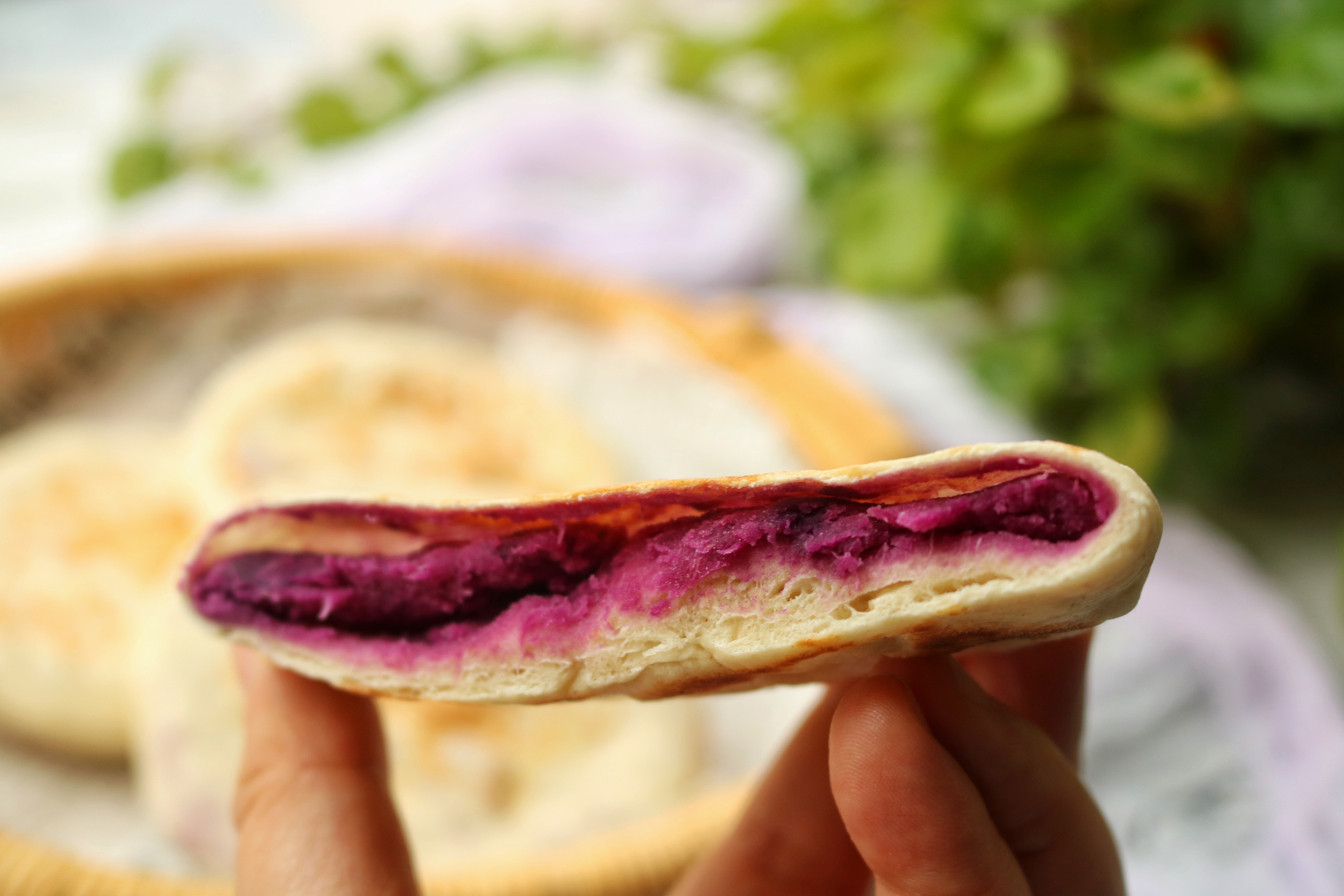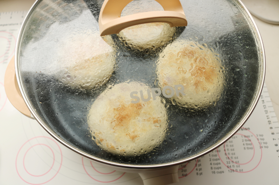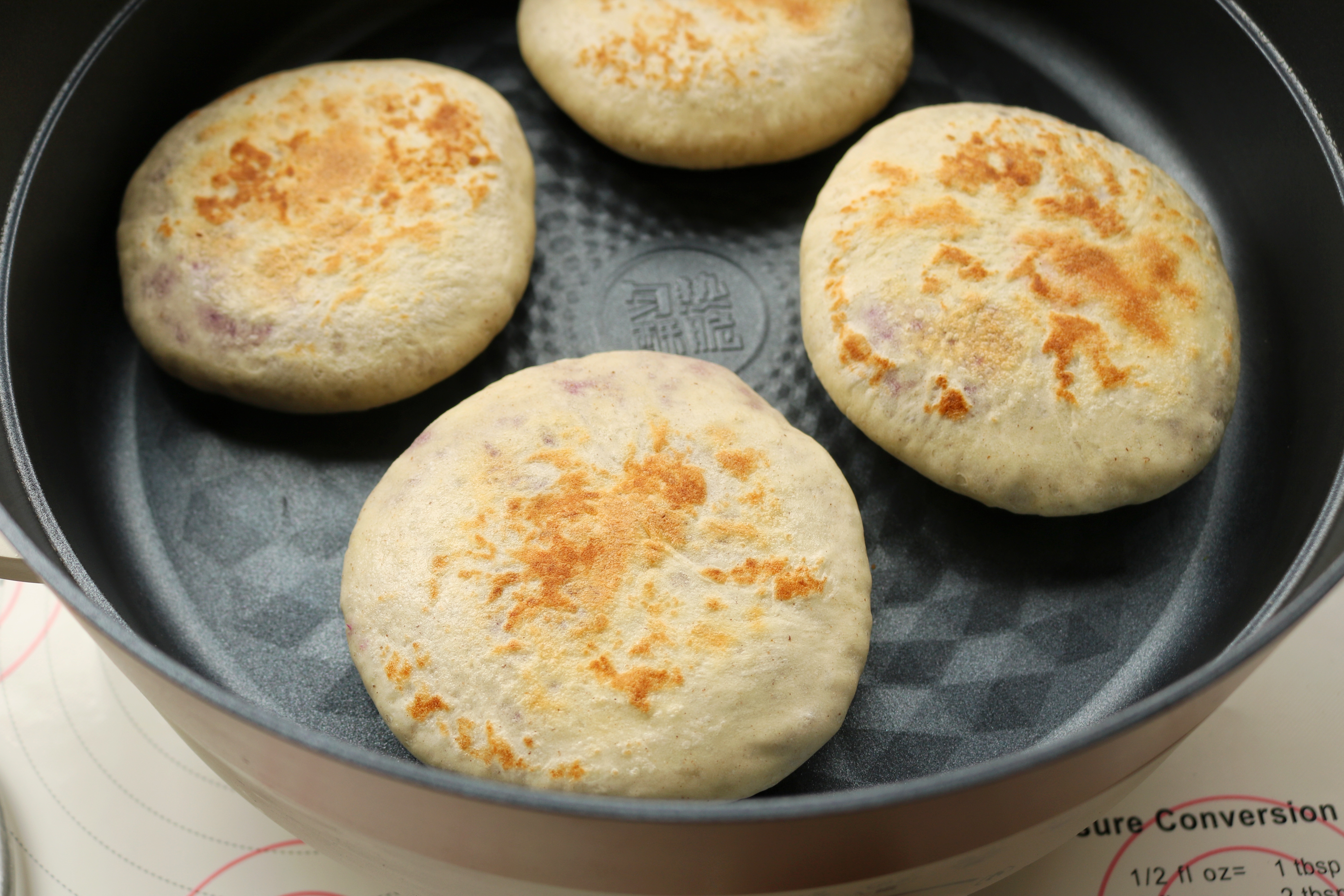 9、翻面烙至表面略微有焦斑,蓋蓋子燜煎,會看到紫薯餅鼓起來。
