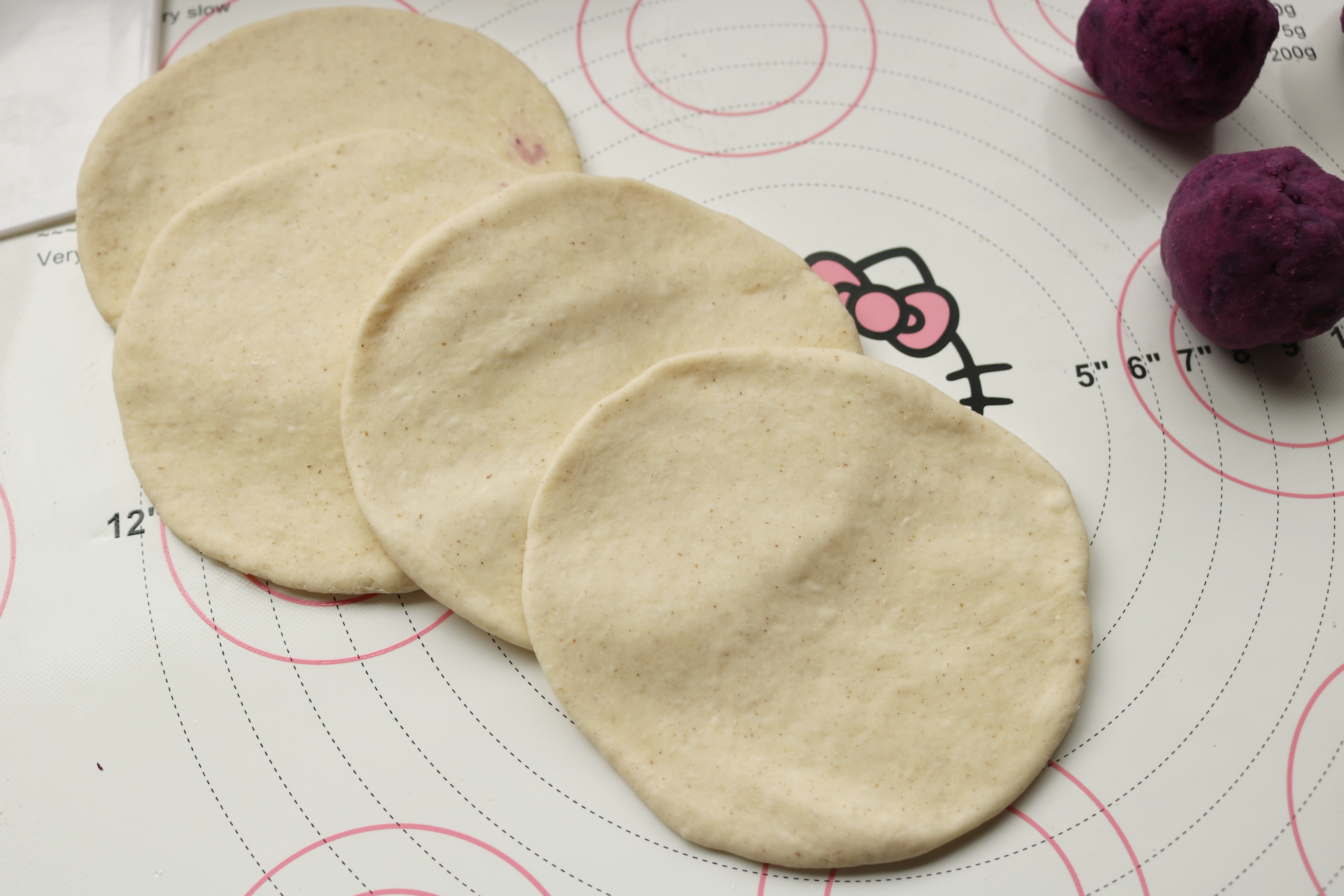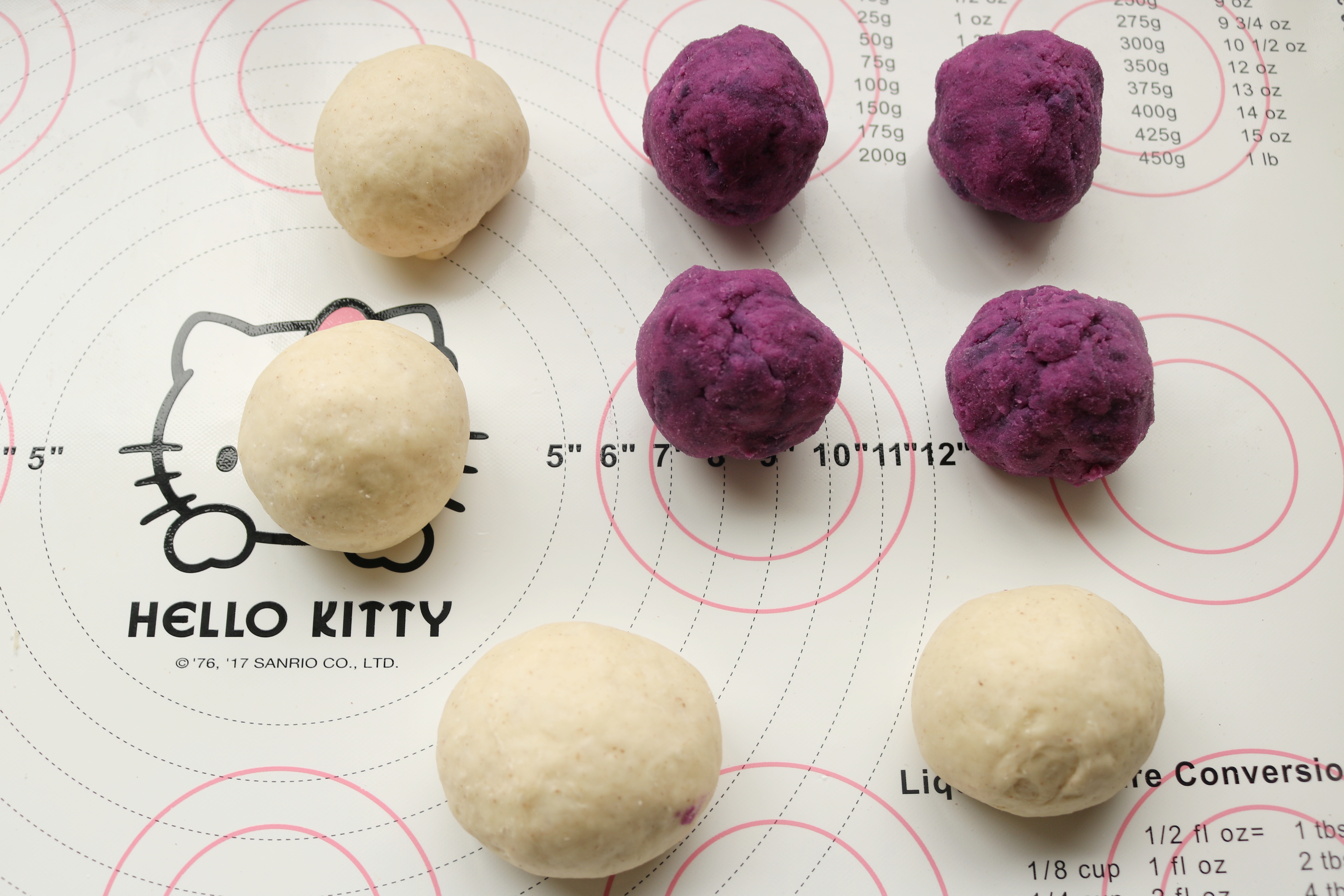 4、發酵好的面團揉圓,分成4份,每個60克,紫薯餡也平均分成4份,每個50克。
