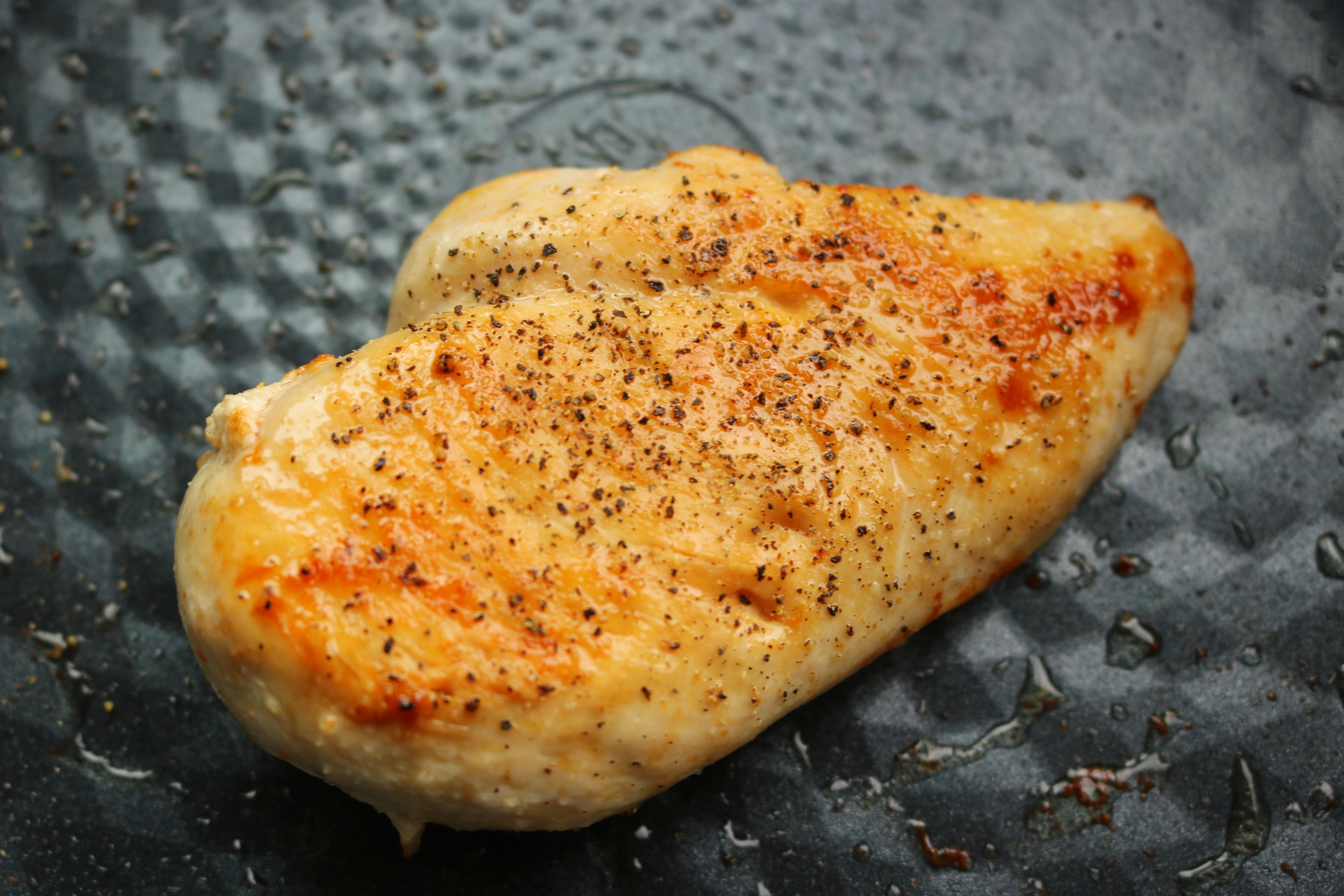 3、蘇泊爾煎烤機,預(yù)熱一下,刷油,放入雞胸肉,蓋蓋子中小火燜煎5分鐘,中間要翻面,兩面都煎熟。