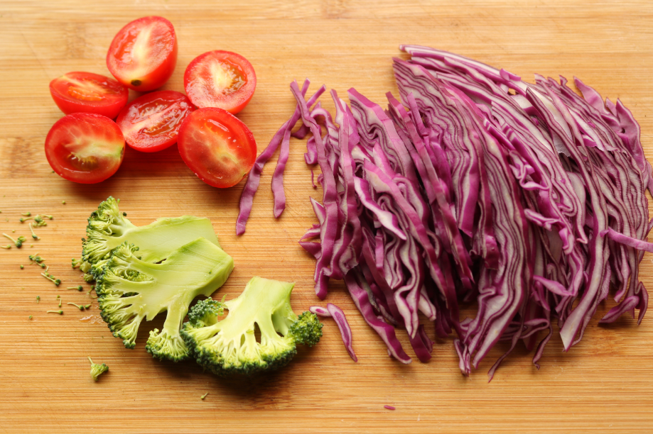 2、食材處理一下,紫甘藍切絲,圣女果切半,西蘭花切片。