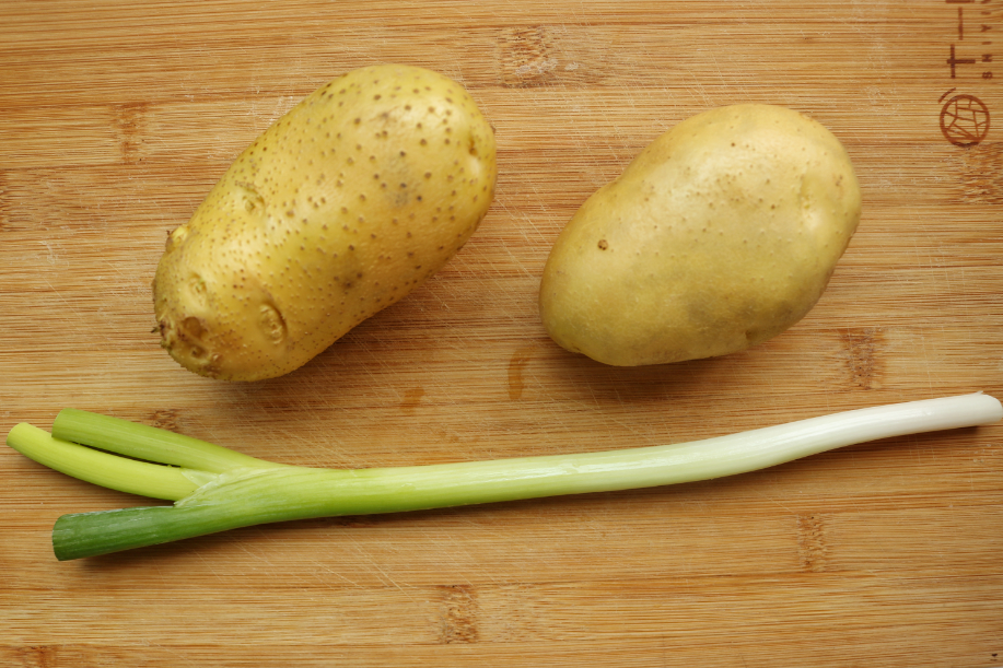 食材:土豆2個,小蔥1棵,鹽2棵,十三香0.5克,色拉油適量