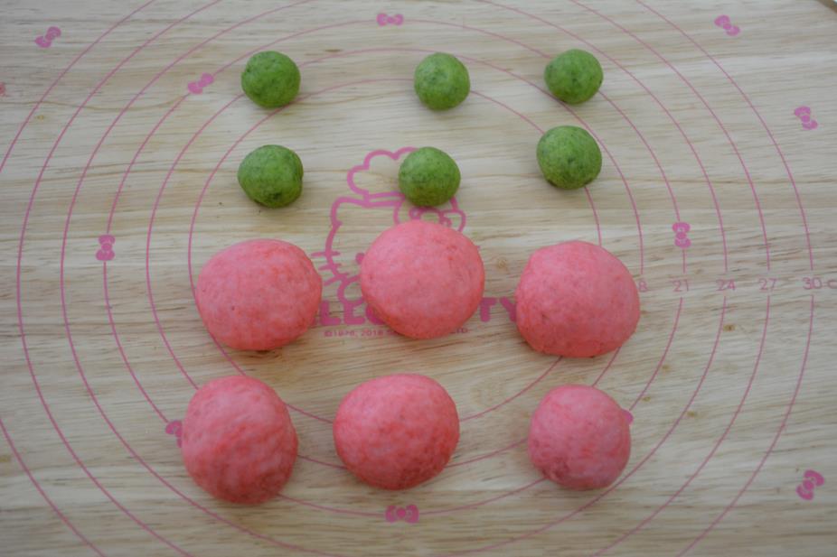 3、加入紅絲絨液的面團(tuán)和抹茶面粉平均分成6份。
