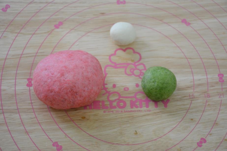 2、取出分為3份,一份10g(白色),一份25g(加入適量抹茶粉),最后一份約140g(加入紅絲絨液),分別混合均勻。