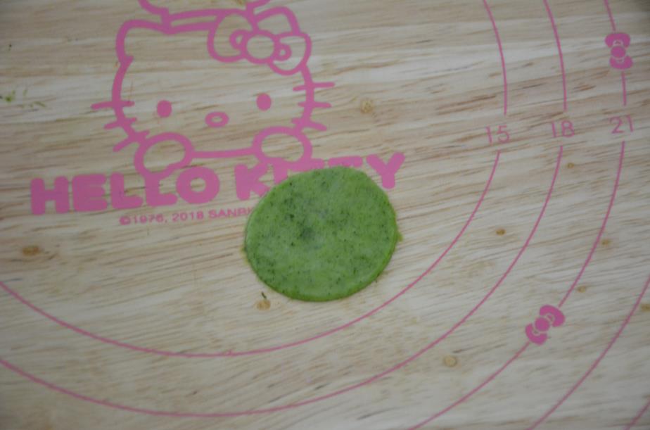 5、取一份抹茶面團(tuán),排氣揉圓壓平后,壓出圓片。