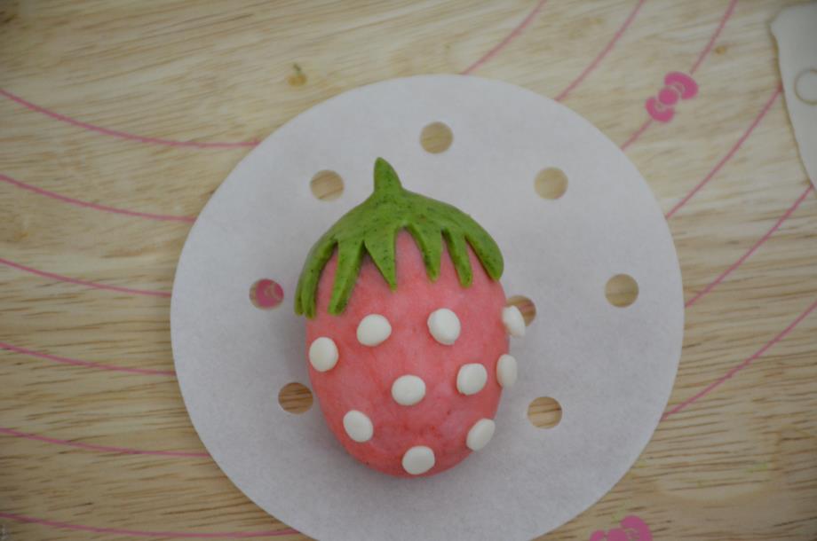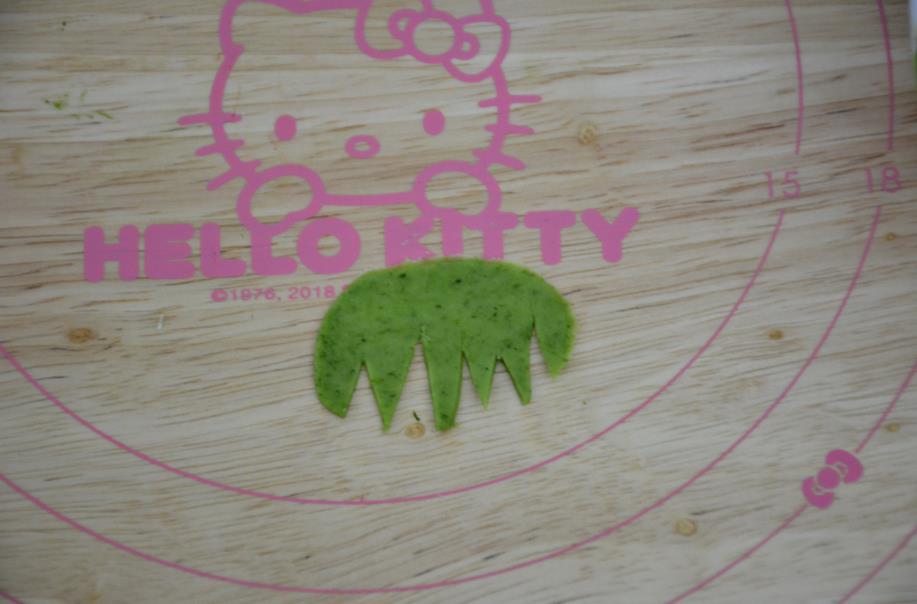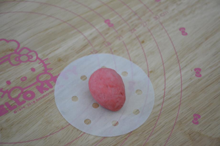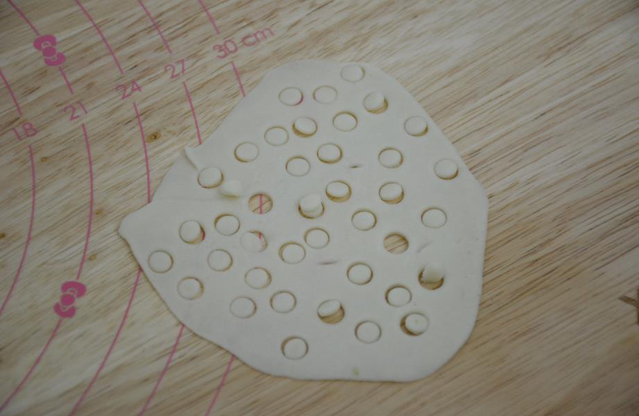 9、白色面團(tuán)排氣壓平,用一個(gè)圓形裱花嘴,壓出小圓圈。