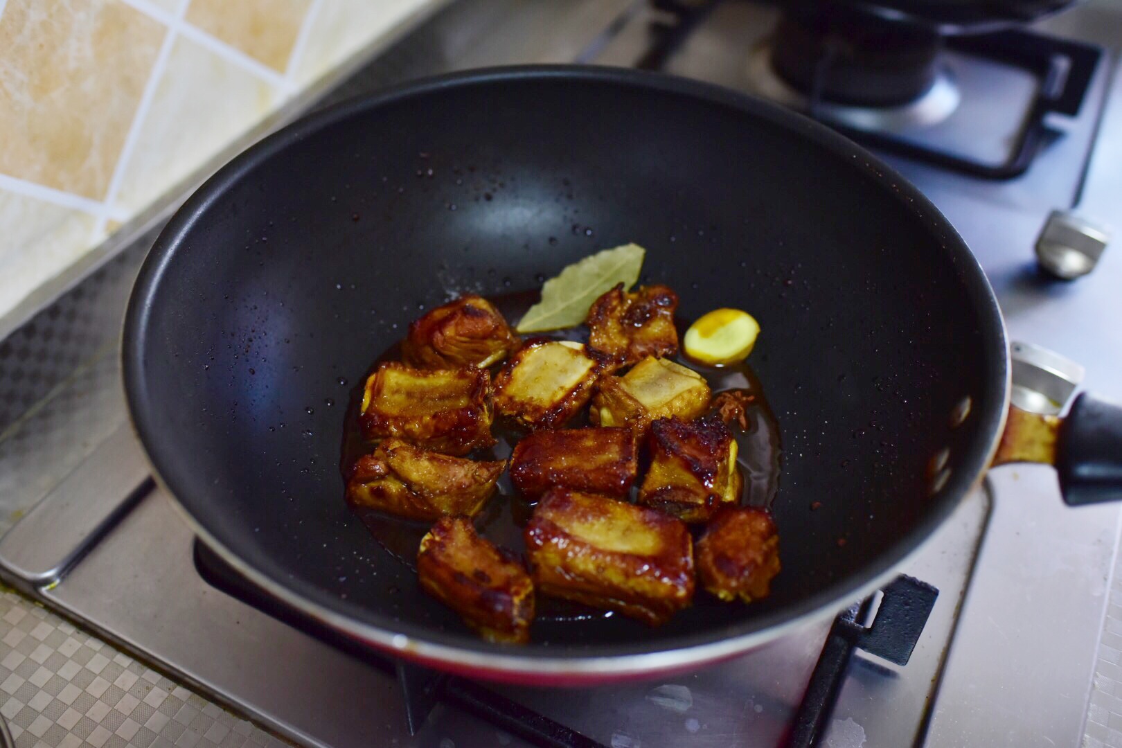 2鍋中放入砂糖加熱,炒至淺褐色時放入排骨炒糖色。