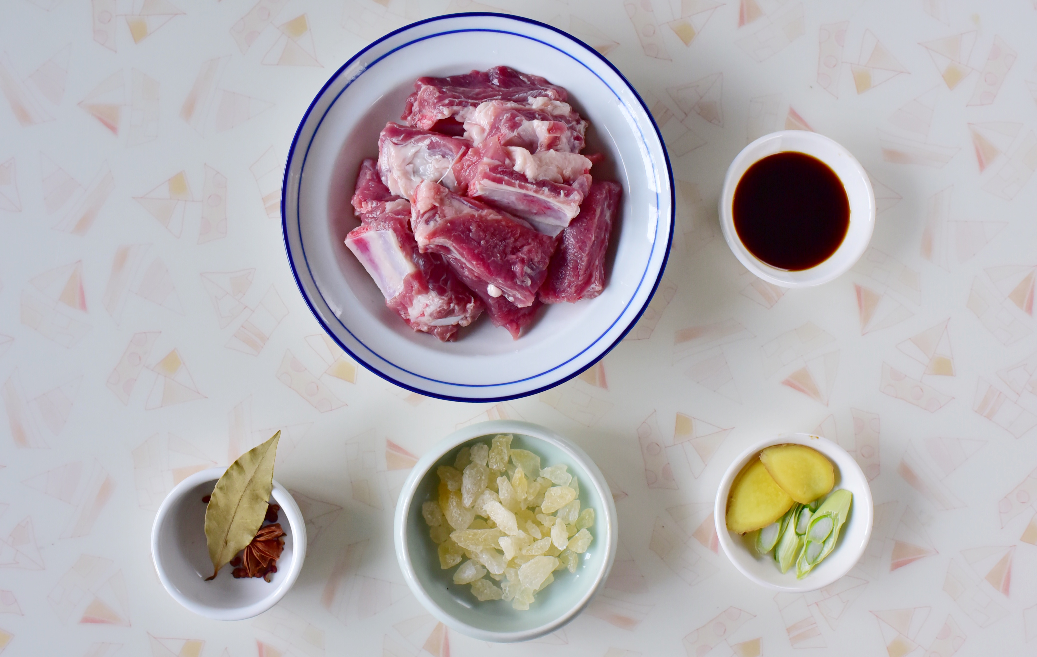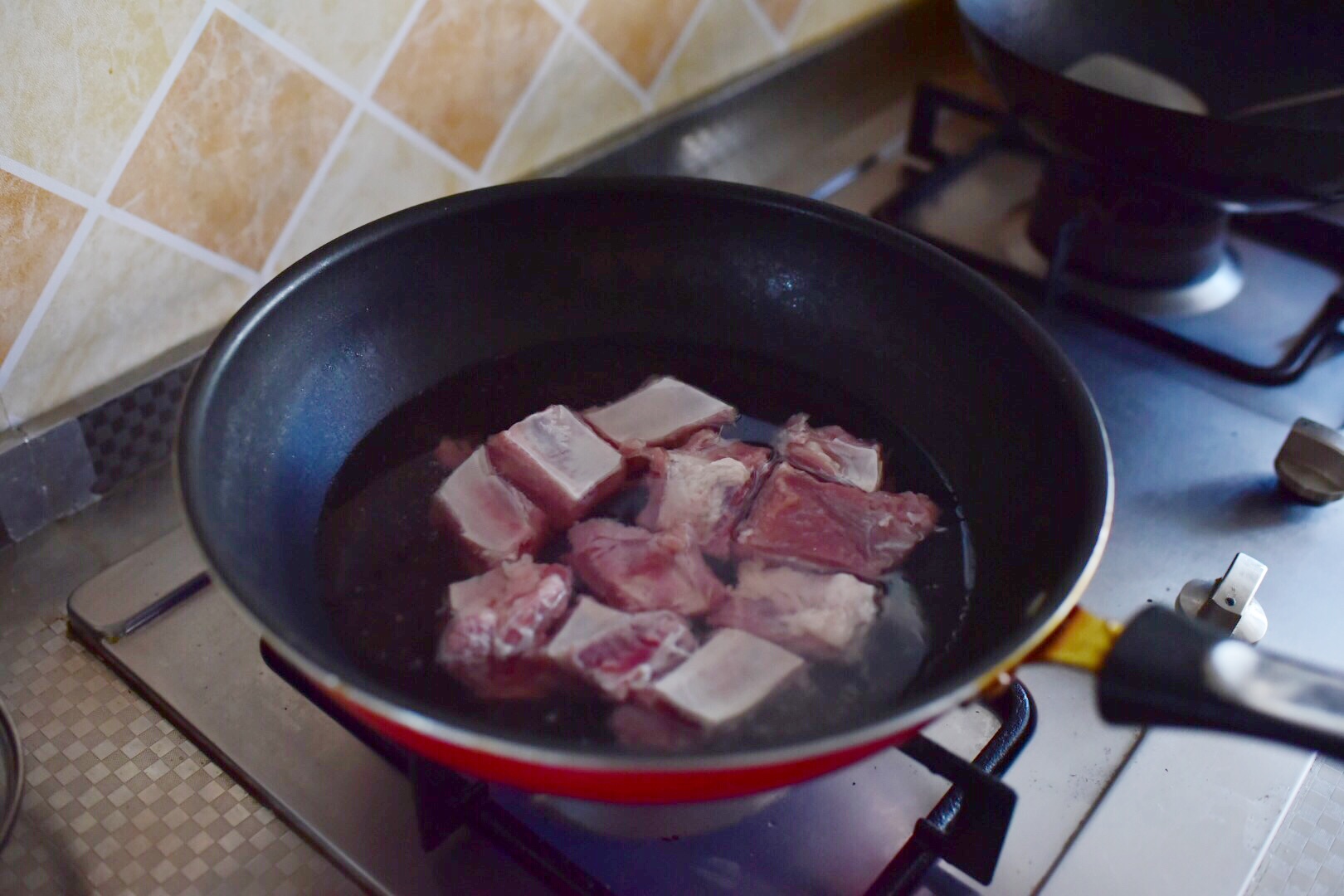 1排骨切塊洗凈放入涼水中焯水,水開撇去浮沫撈出洗凈控水備用。