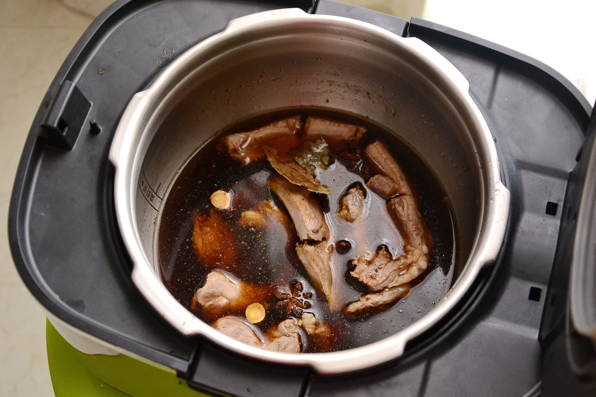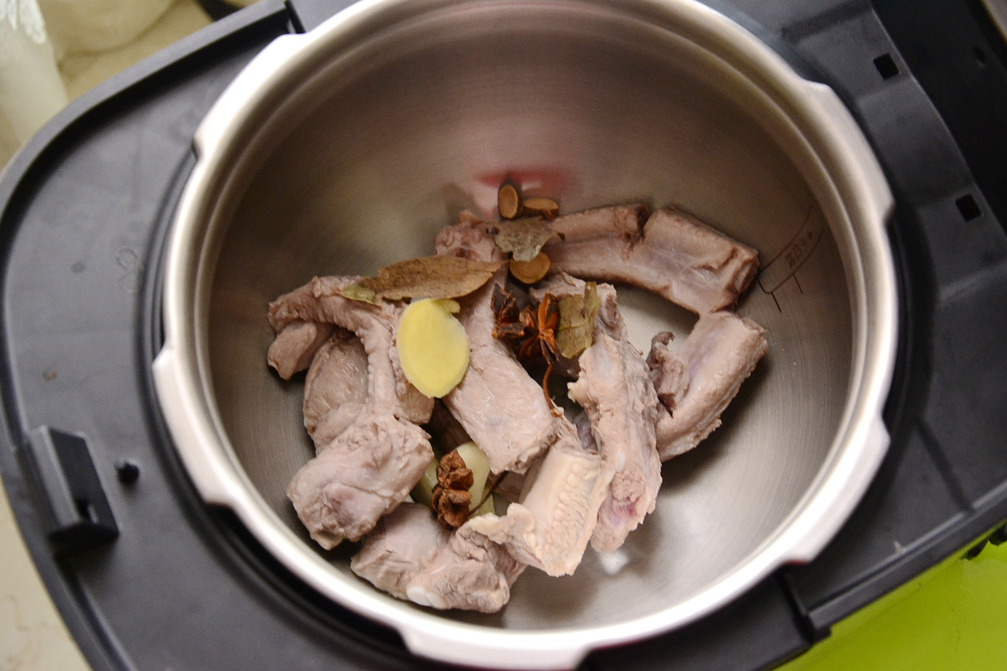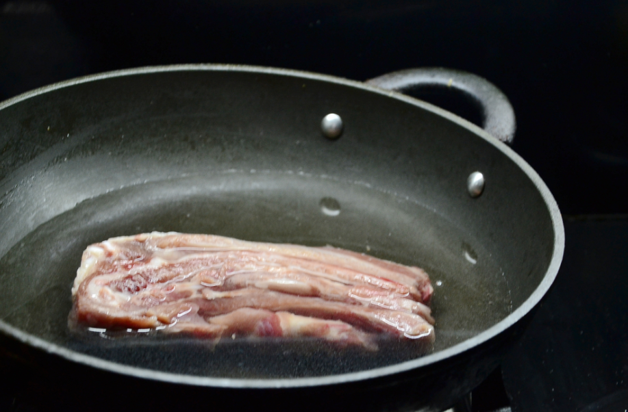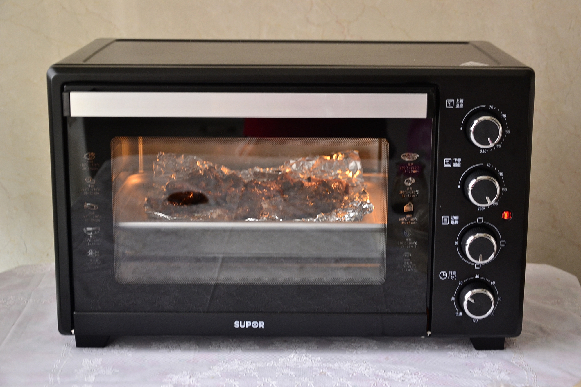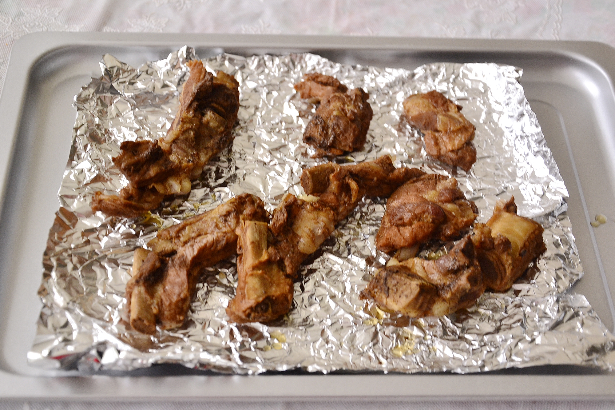 4、煮好的肋排取出排在烤網上,刷上一層燒烤醬,撒少許的辣椒粉、孜然粉