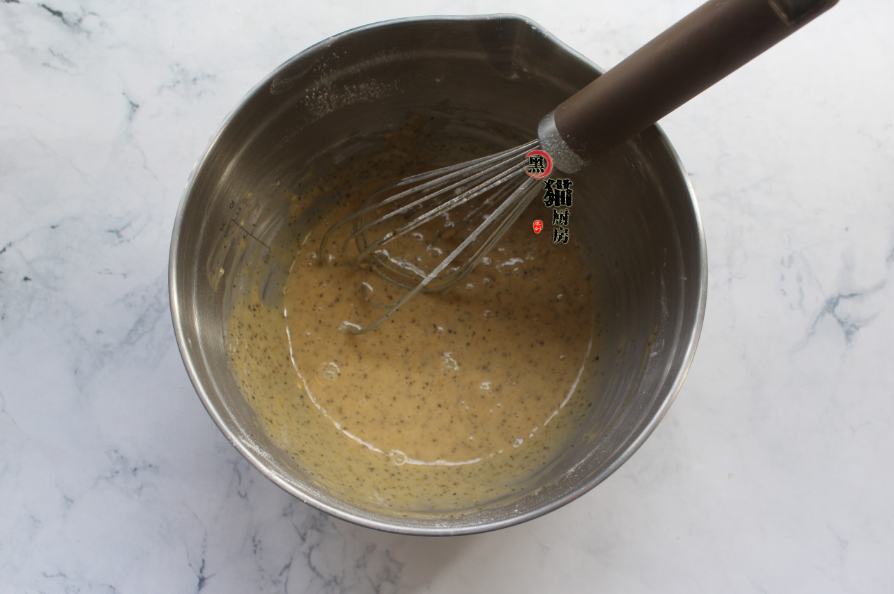 3. 拌勻后加入雞蛋和檸檬屑,用蛋抽拌勻。