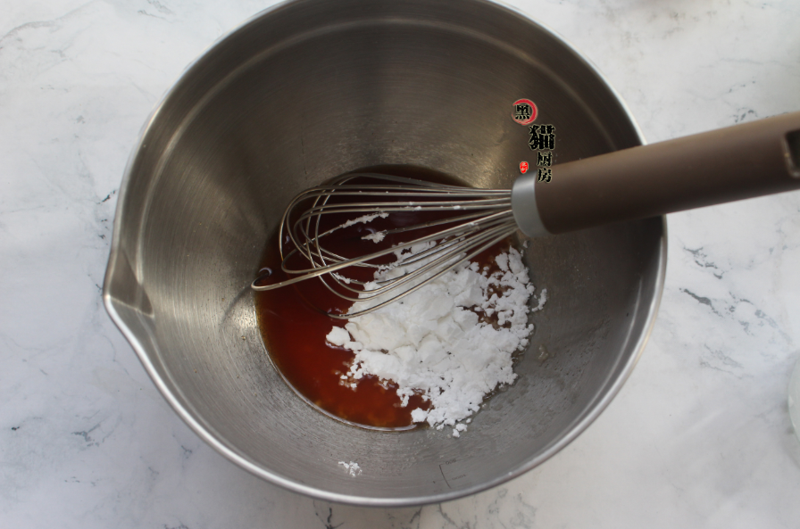 2. 錫蘭紅茶包用熱水浸泡出茶香味,液體呈紅棕色,把準備好的糖粉倒入,充分攪拌至糖粉融化。