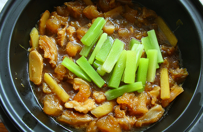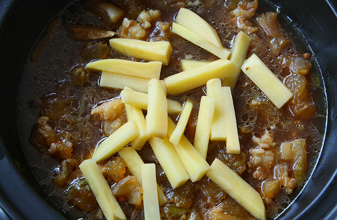 4、烹飪時間剩余20分鐘時倒入萵筍、土豆繼續(xù)燜煮