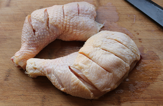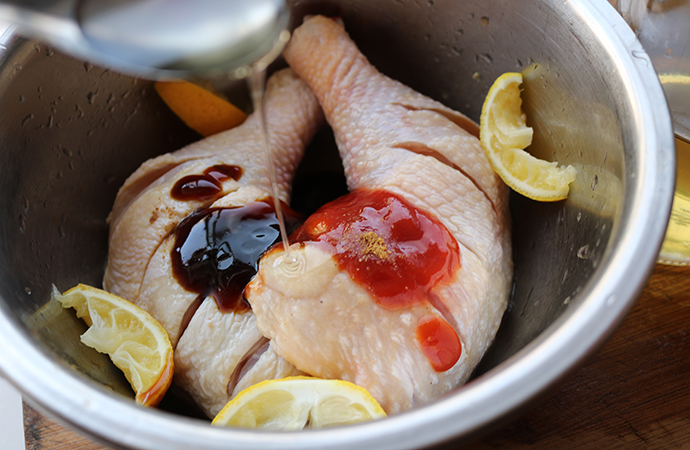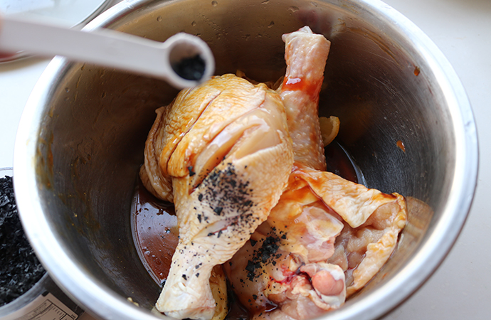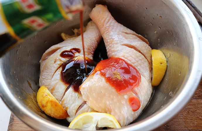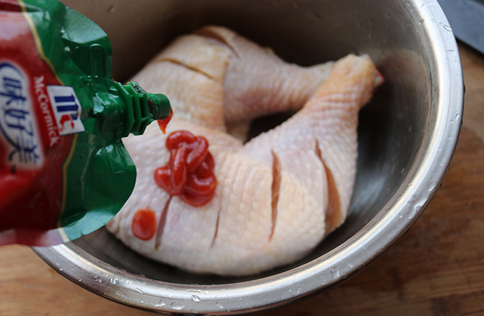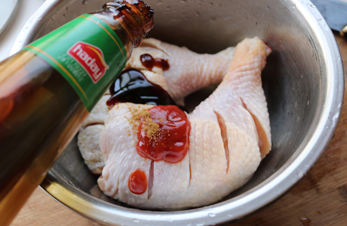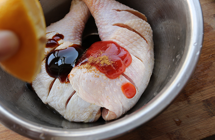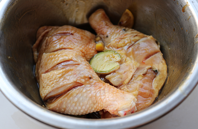 13、把腌汁也澆在雞腿上面