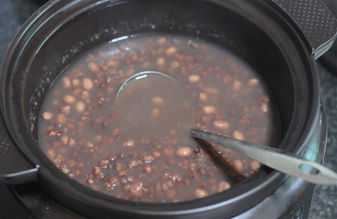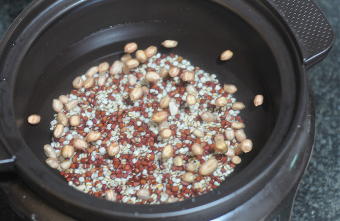 5.將處理好的雜糧放入電砂鍋里,放入半鍋清水