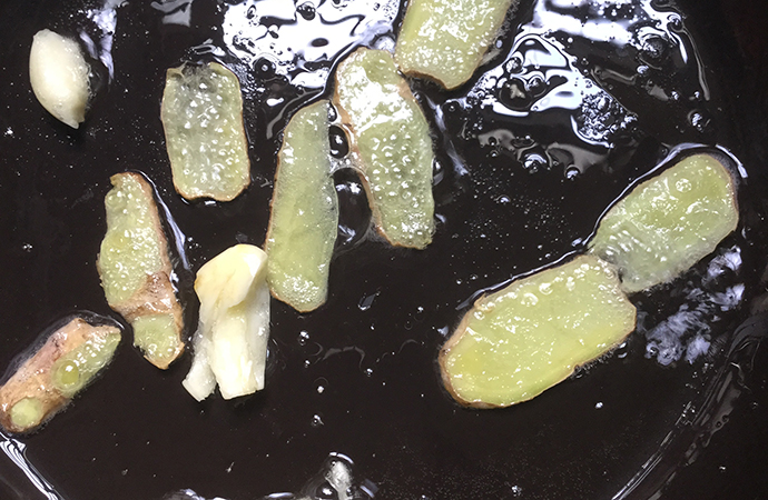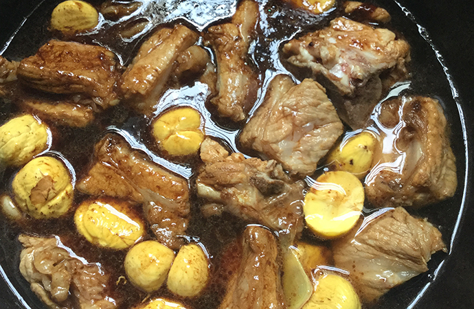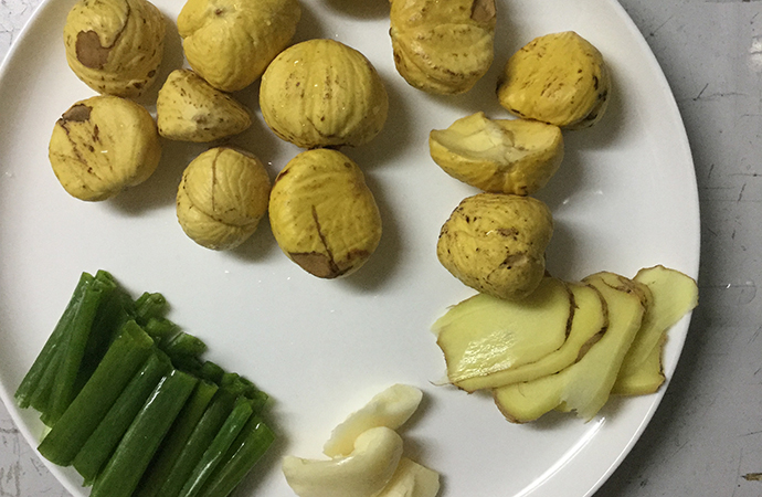 【材料】:去皮板栗250克、排骨2條、姜5片、蔥段若干、獨頭蒜1顆、花生油5克