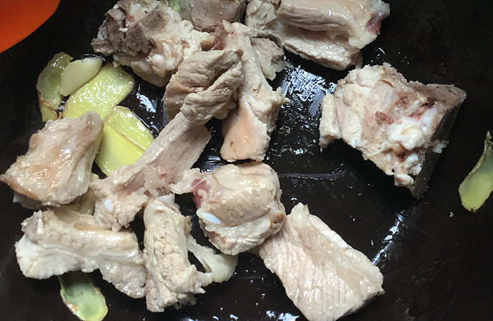 7、倒入鍋中,把排骨翻炒均勻,裹上醬色