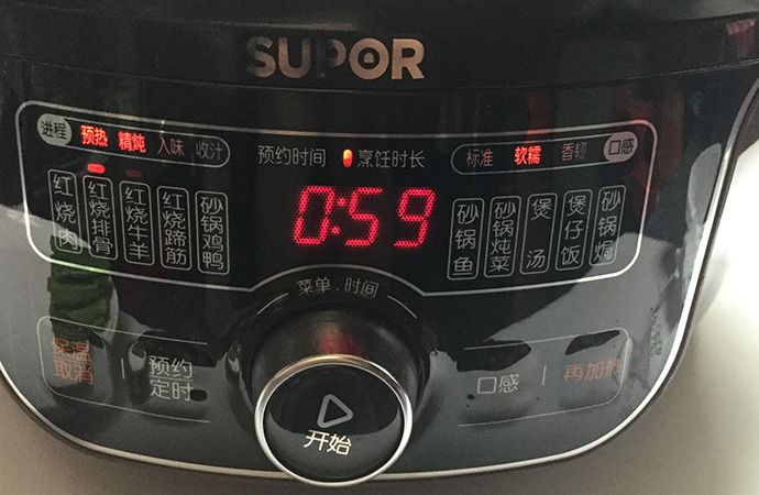 3、倒入花生油,砂鍋選擇“紅燒排骨“,口感”軟糯“,按”開始“,砂鍋開始預熱(我剛開始的時候忘記拍照了,就補一張中途的吧)