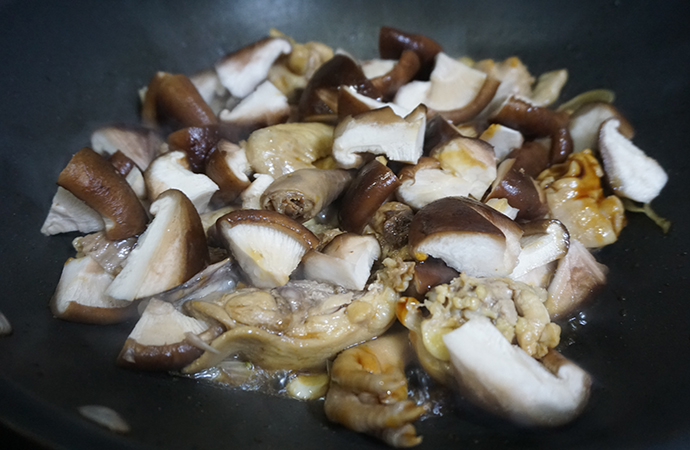 5.再放入香菇塊,加入沒過食材的開水。所有食材都倒入蘇泊爾電壓力鍋的內膽中;