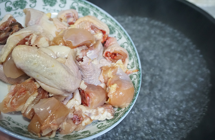 2.坐熱一鍋沸水,下雞塊焯一下,去掉浮沫;