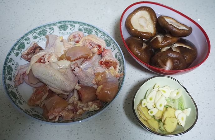 1.準備好需要的食材,半只雞粘小塊,洗去血水。香菇切小塊。蔥段姜片蒜瓣切適量;