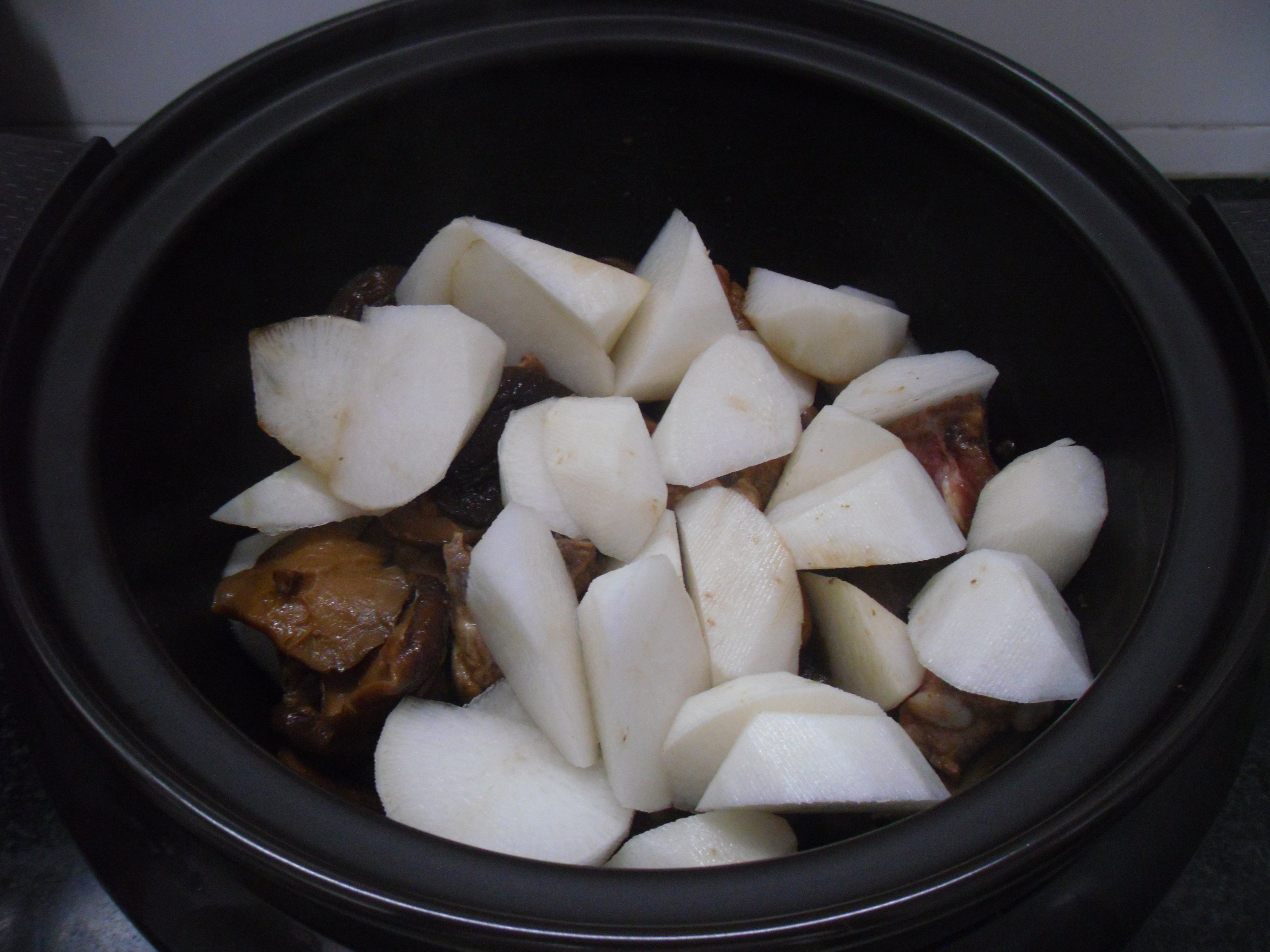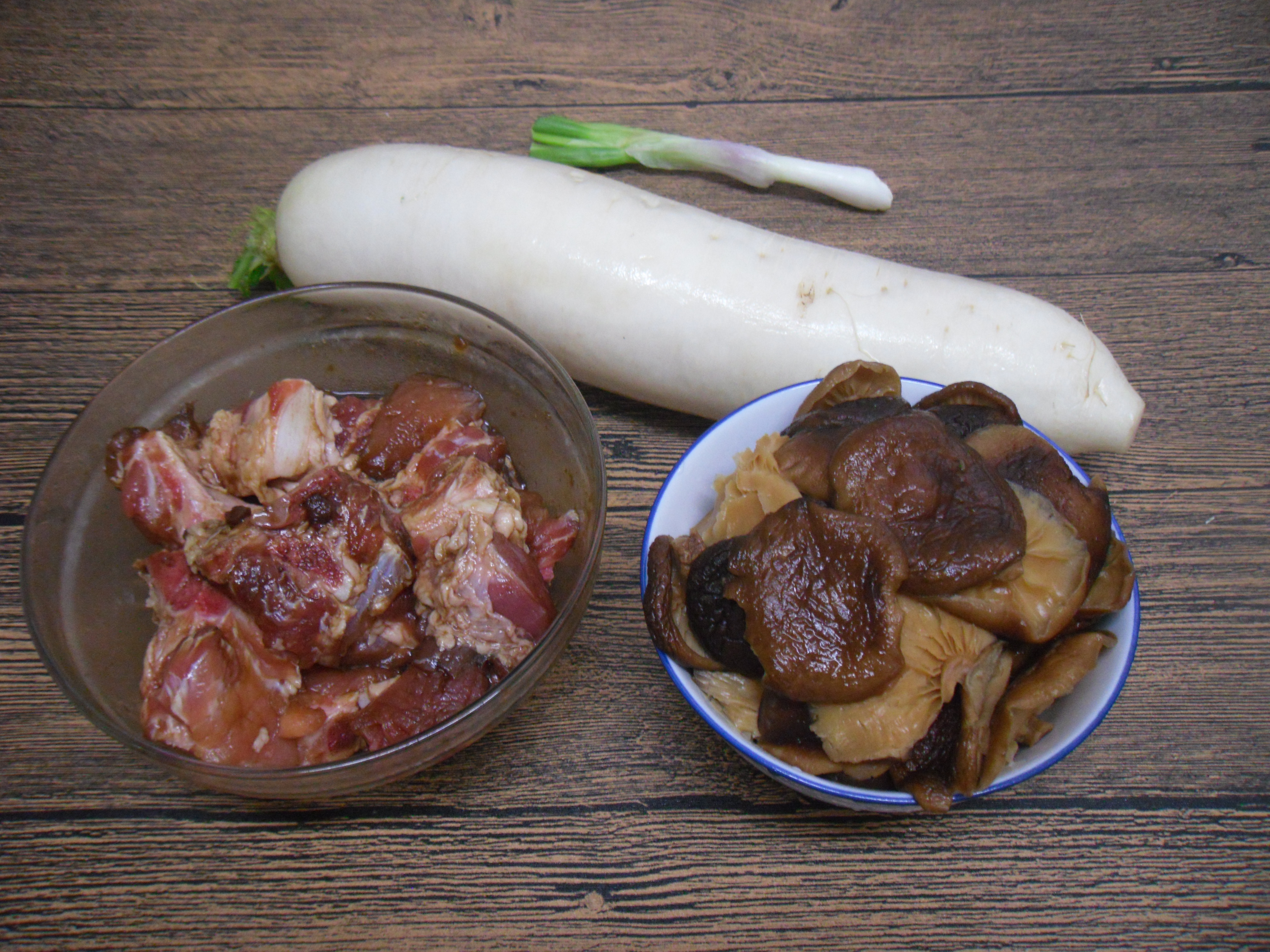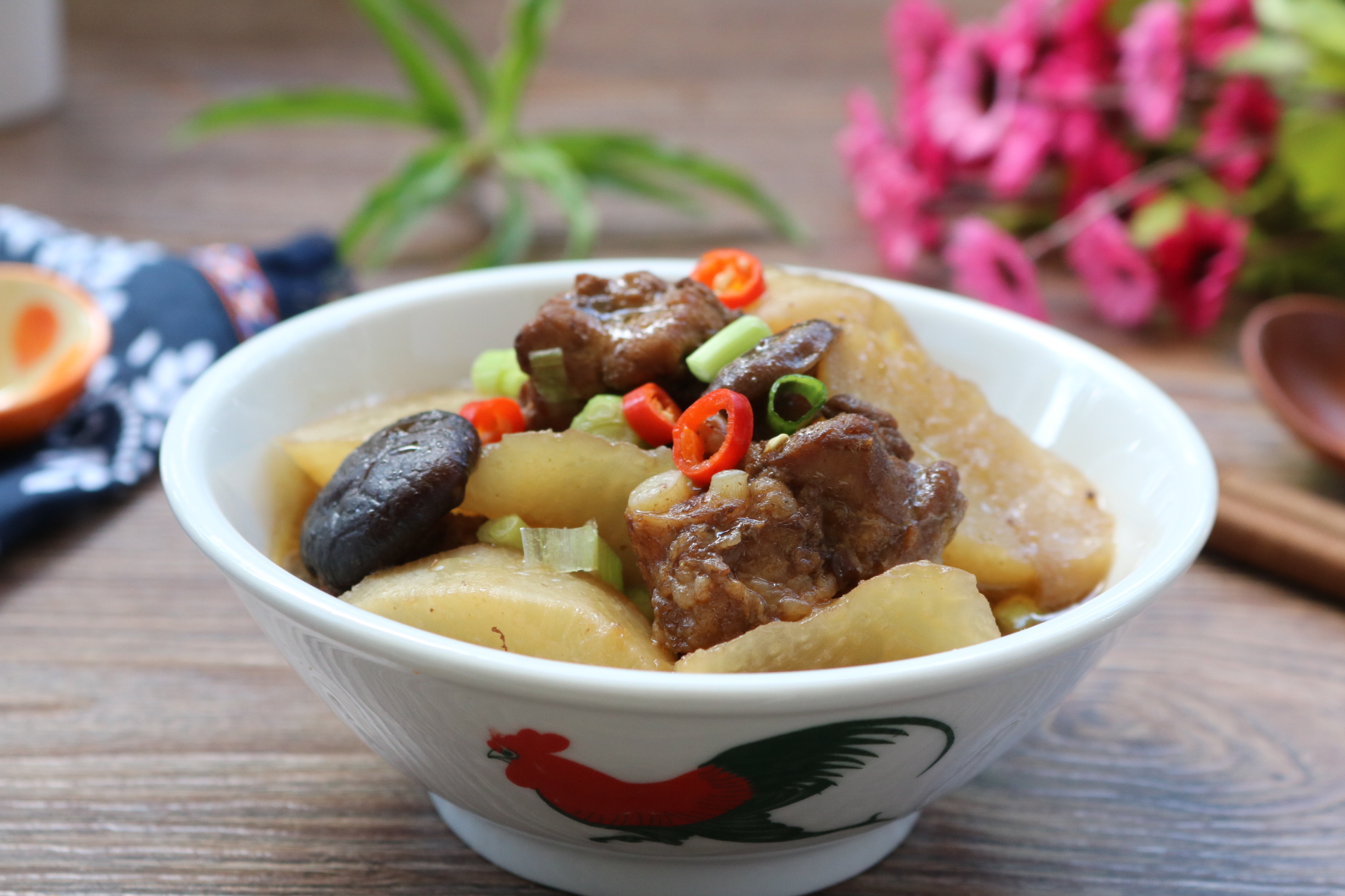 【食材】排骨300克、蘿卜500克、香菇80克、鹽5克、照燒汁2湯匙、淀粉1湯匙、老抽2克、小蔥一根、橄欖油5克、清水400克