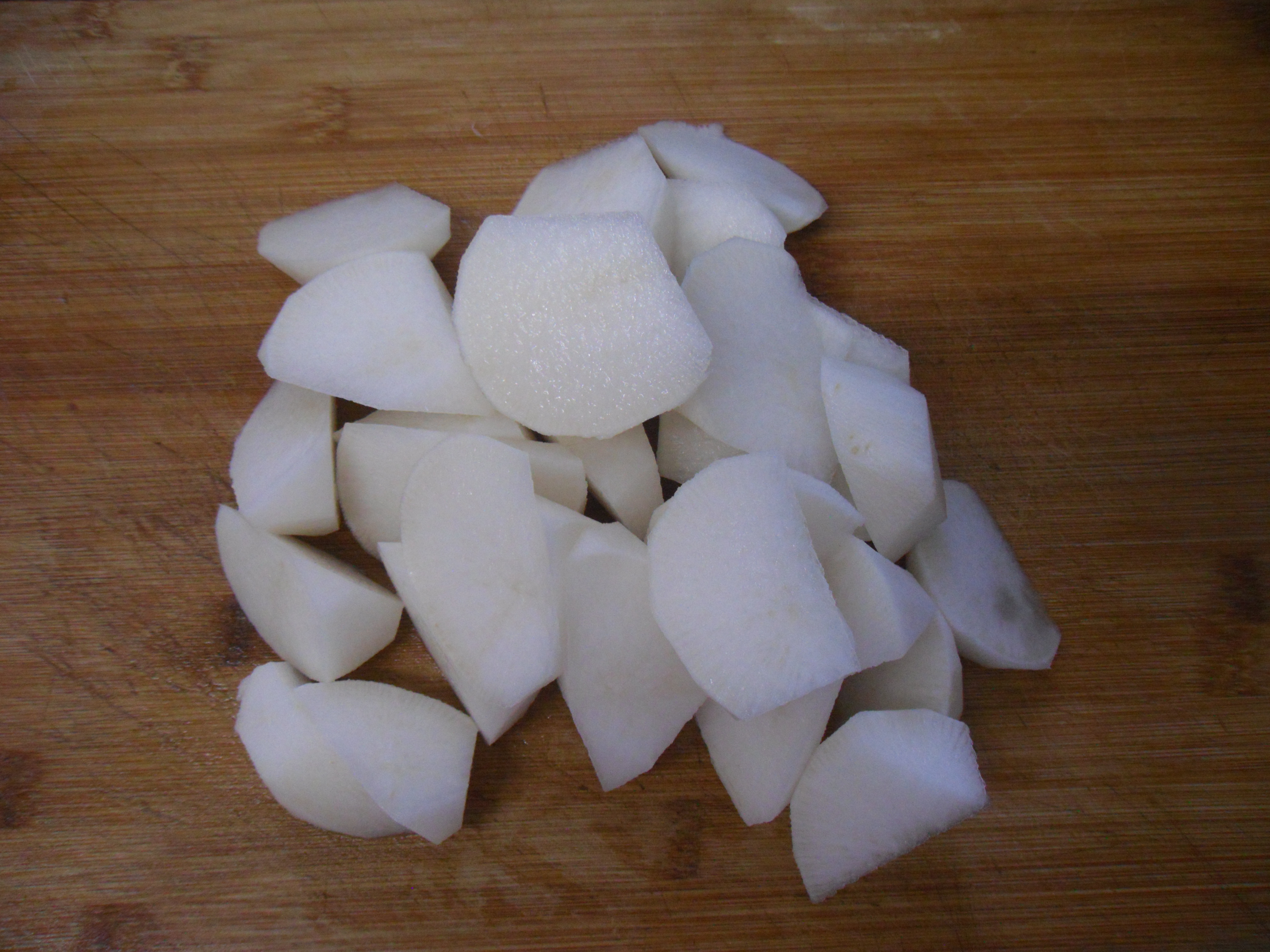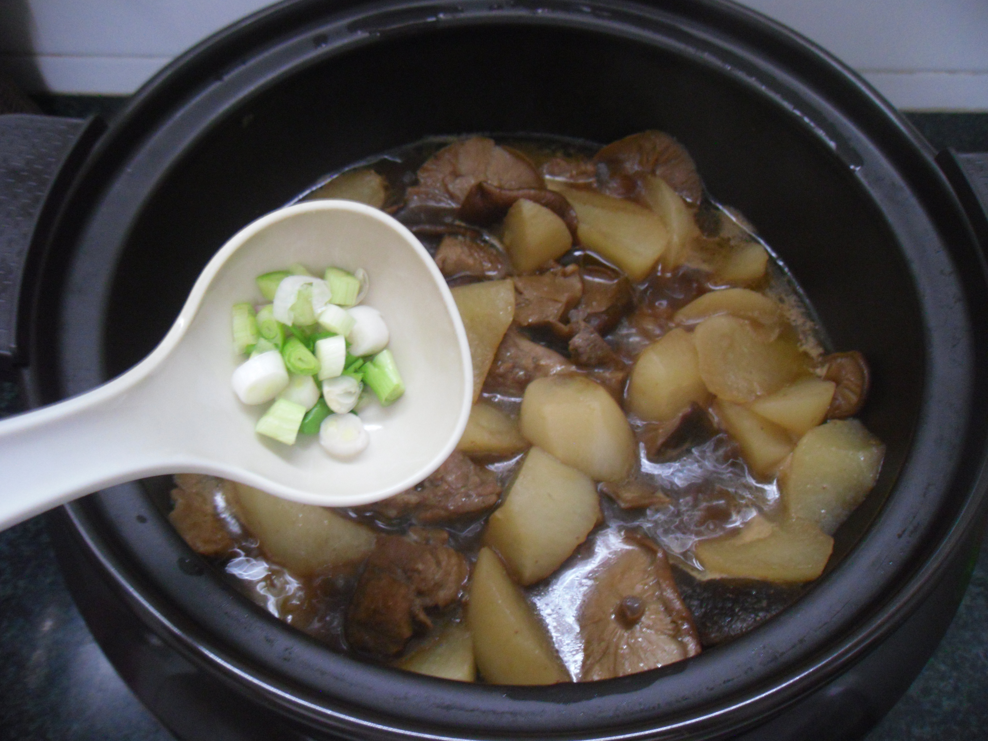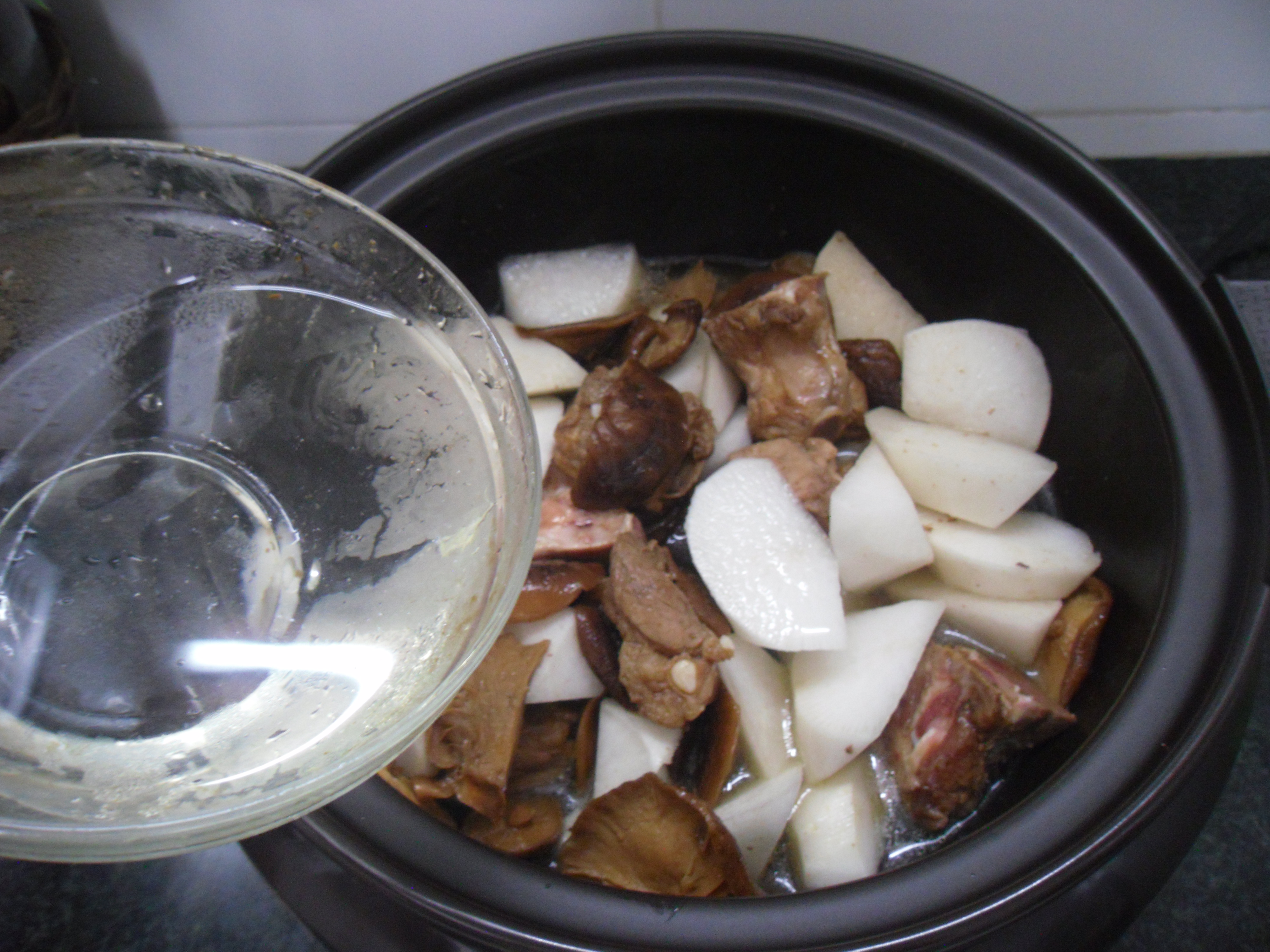 【食材】排骨300克、蘿卜500克、香菇80克、鹽5克、照燒汁2湯匙、淀粉1湯匙、老抽2克、小蔥一根、橄欖油5克、清水400克
