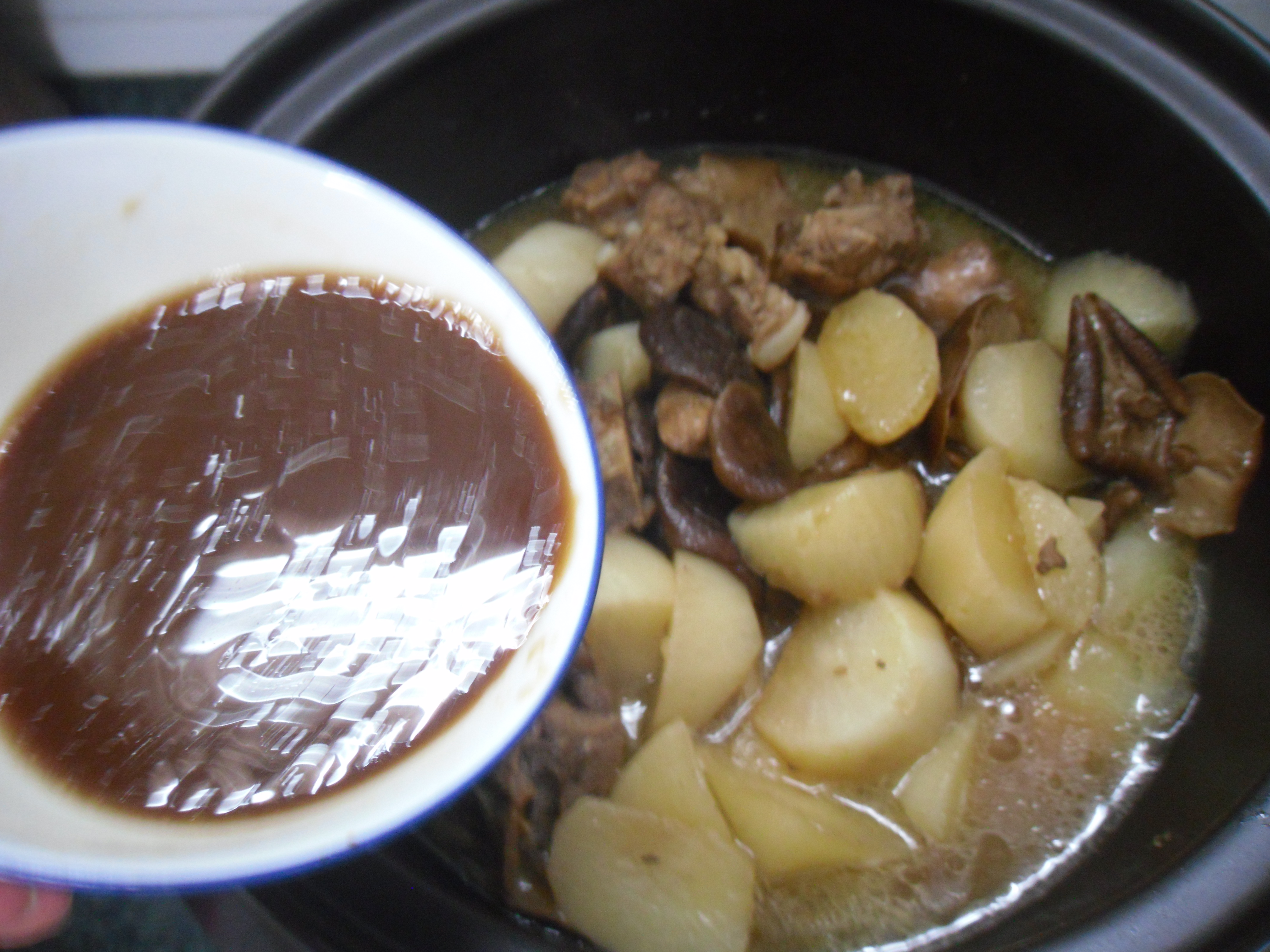 11. 烹調時間剩下10分鐘時,調點料汁,少許清水兌入淀粉,老抽拌勻,倒入鍋中,遮上蓋子燜10分鐘左右