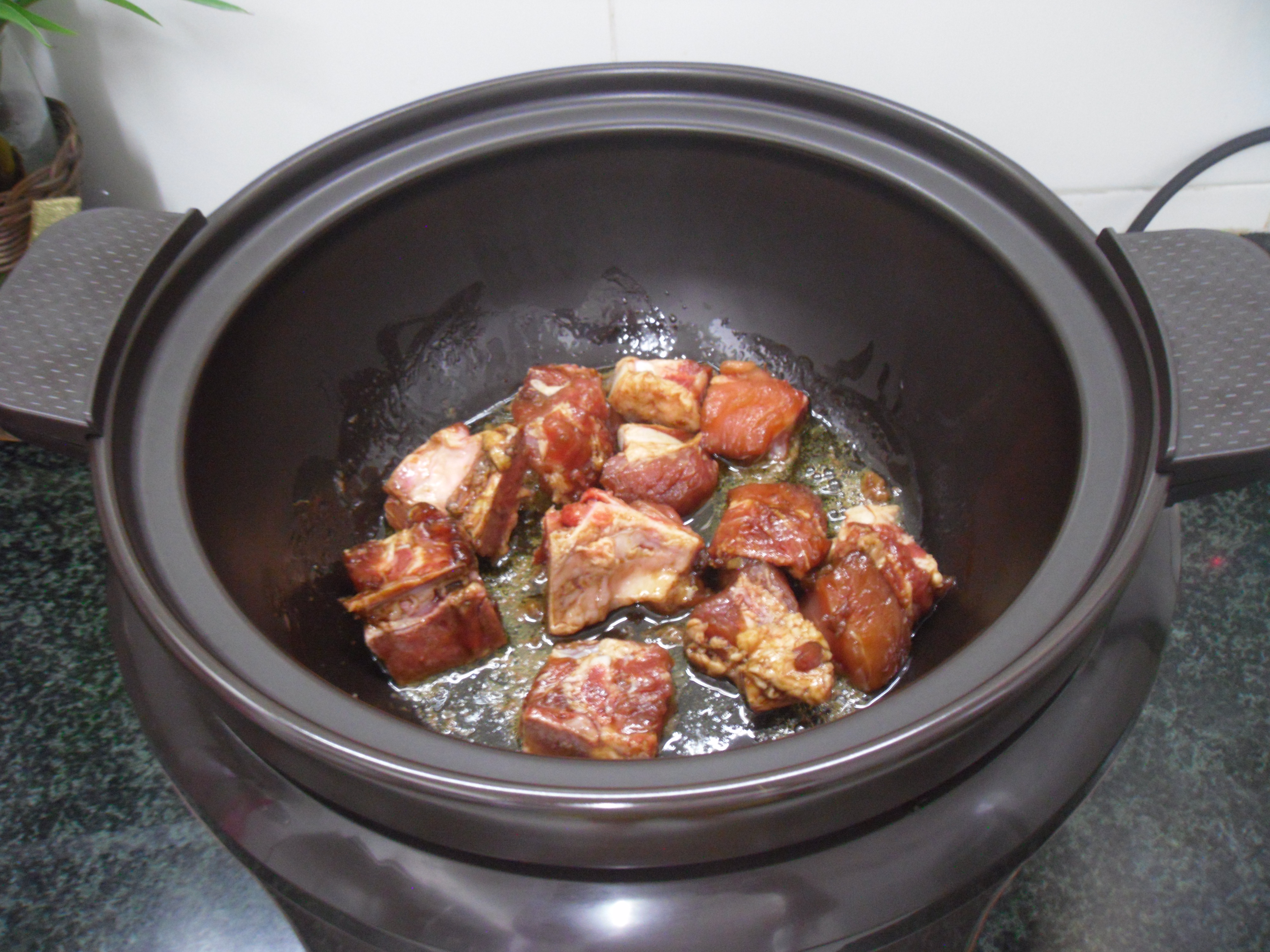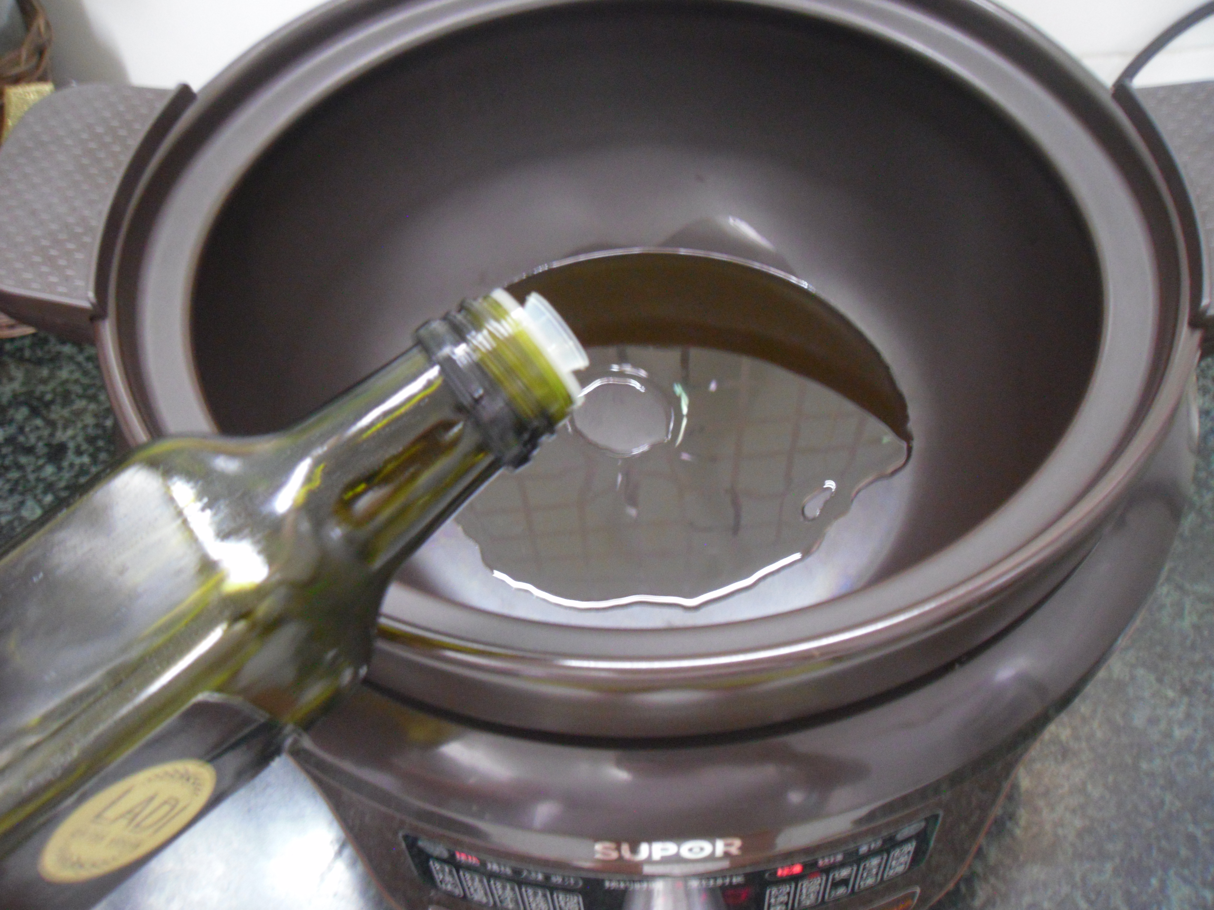 5. 電砂鍋通電,選擇紅燒排骨鍵,倒入橄欖油