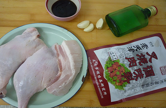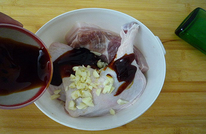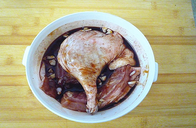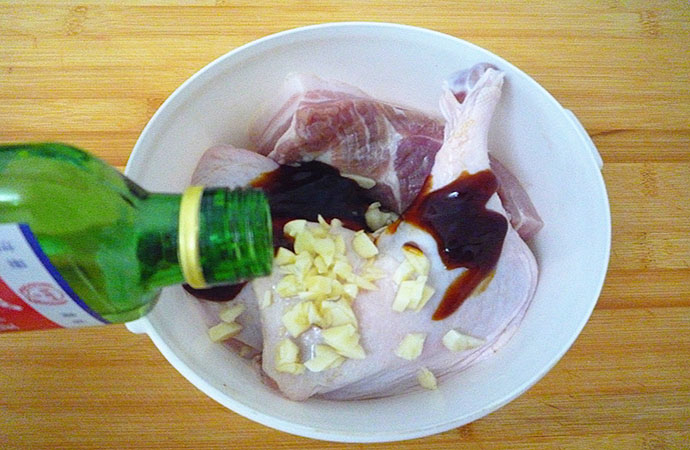 3.鴨腿洗凈放入容器中,加入大蒜末、蠔油
