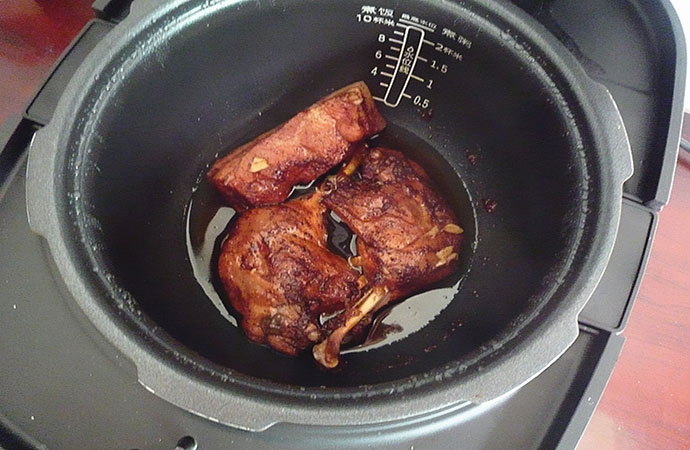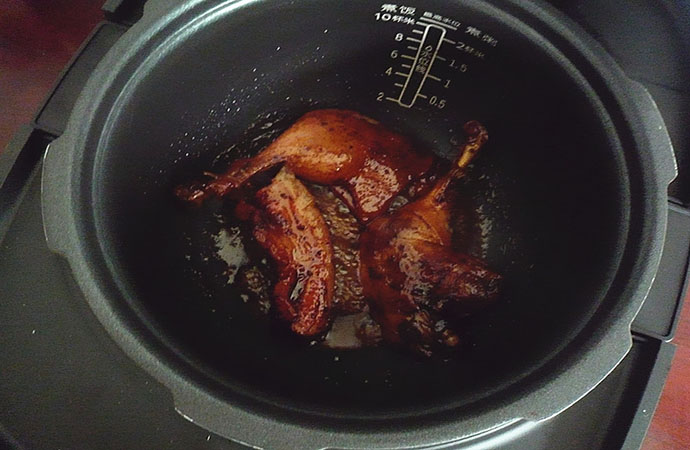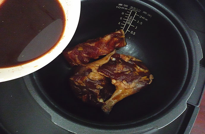 6.腌漬好的鴨腿放入壓力鍋中,加入少許腌漬料汁