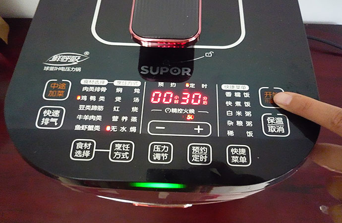 7.蓋緊壓力鍋蓋子,食材選擇—雞鴨,烹飪方式-無水焗,時間定時-30分鐘,壓力默認50,按開始鍵啟動