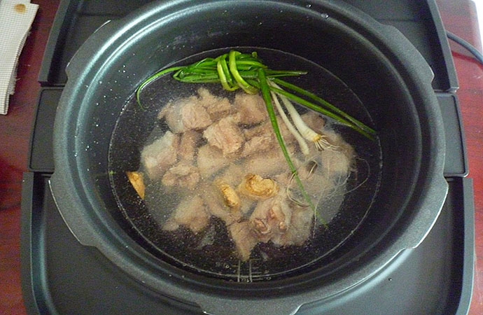 5.小排、蔥姜一茶匙料酒一起放入壓力鍋中,加入足量的水