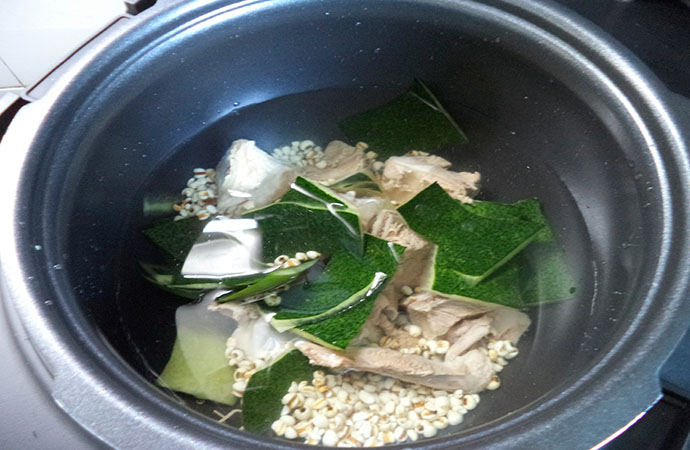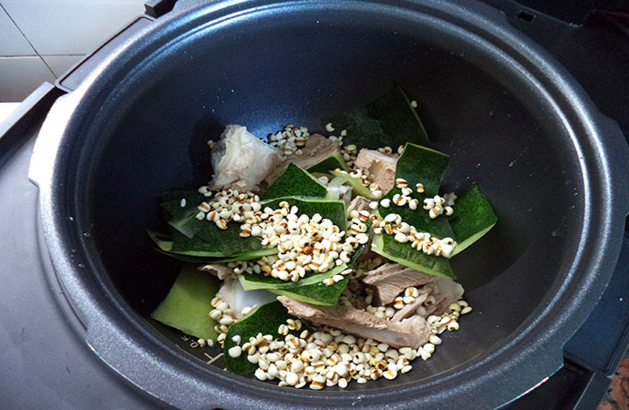 3.把冬瓜皮,薏米,豬骨頭放入電壓力鍋中