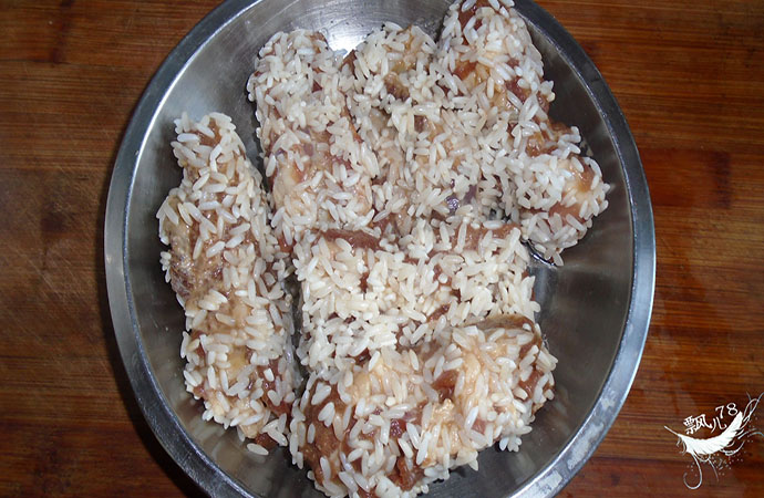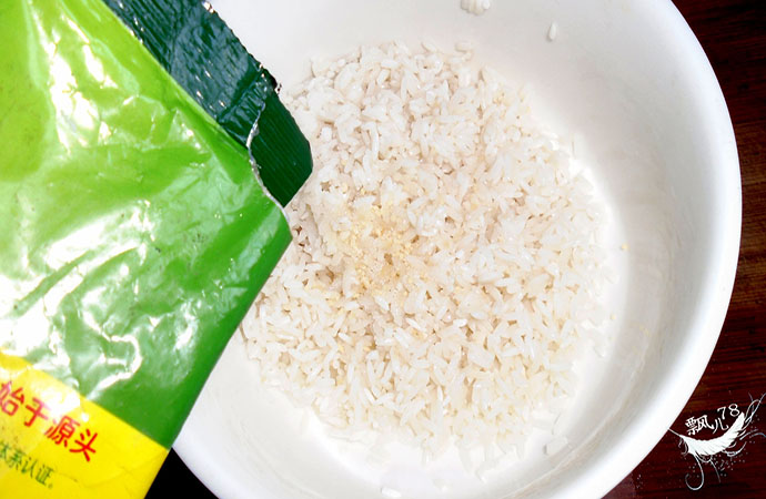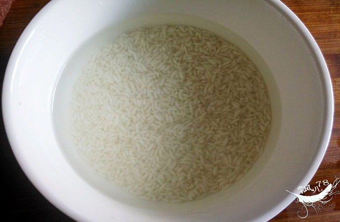 6.泡好的糯米瀝干水分,加入適量鹽和雞精拌勻