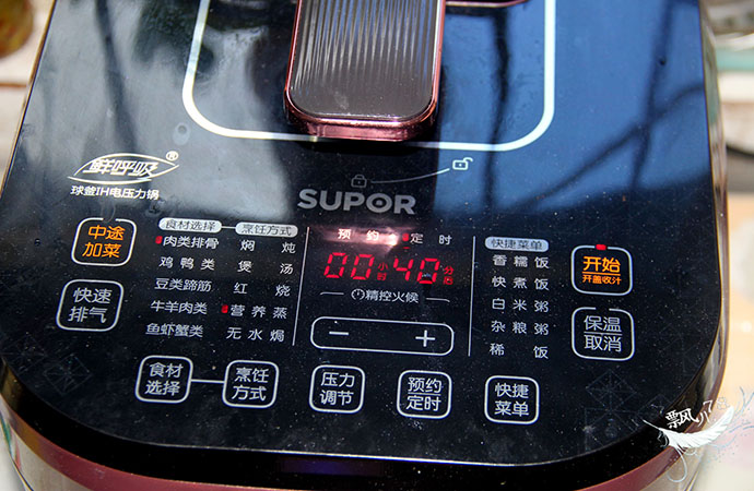 9.壓力鍋扭緊蓋,食材選擇肉類排骨,烹飪方式選擇營養蒸,再按開始程序即可