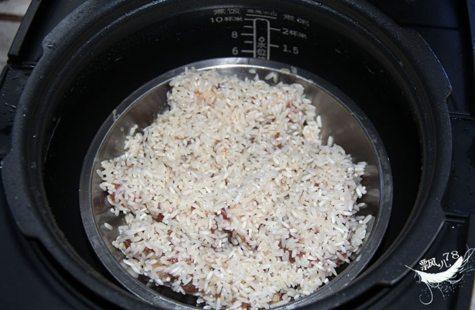 8.然后將余下的糯米也倒進蝶子里,壓力鍋里倒入適量水
