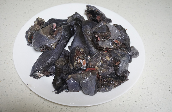 2. 烏雞一只斬成小段,先做開一鍋水,烏雞入水焯一下,為的是去除雞肉的血水和浮沫