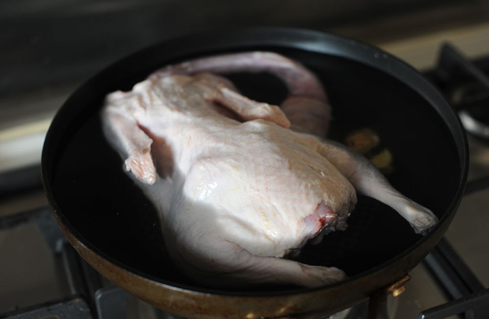9. 把沖洗好的鴨子放入鋪好了其他食材的球釜中,加入清水和料酒,不需要淹沒,大約淹沒鴨子的一半就好