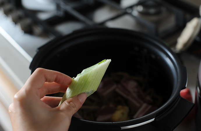 7. 大蔥成段放入鍋中,也可以用2-3棵小蔥代替