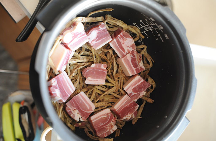 5. 在蘇泊爾鮮呼吸100壓力鍋的黑金球釜內膽中先鋪入泡好的筍干,然后排入咸肉