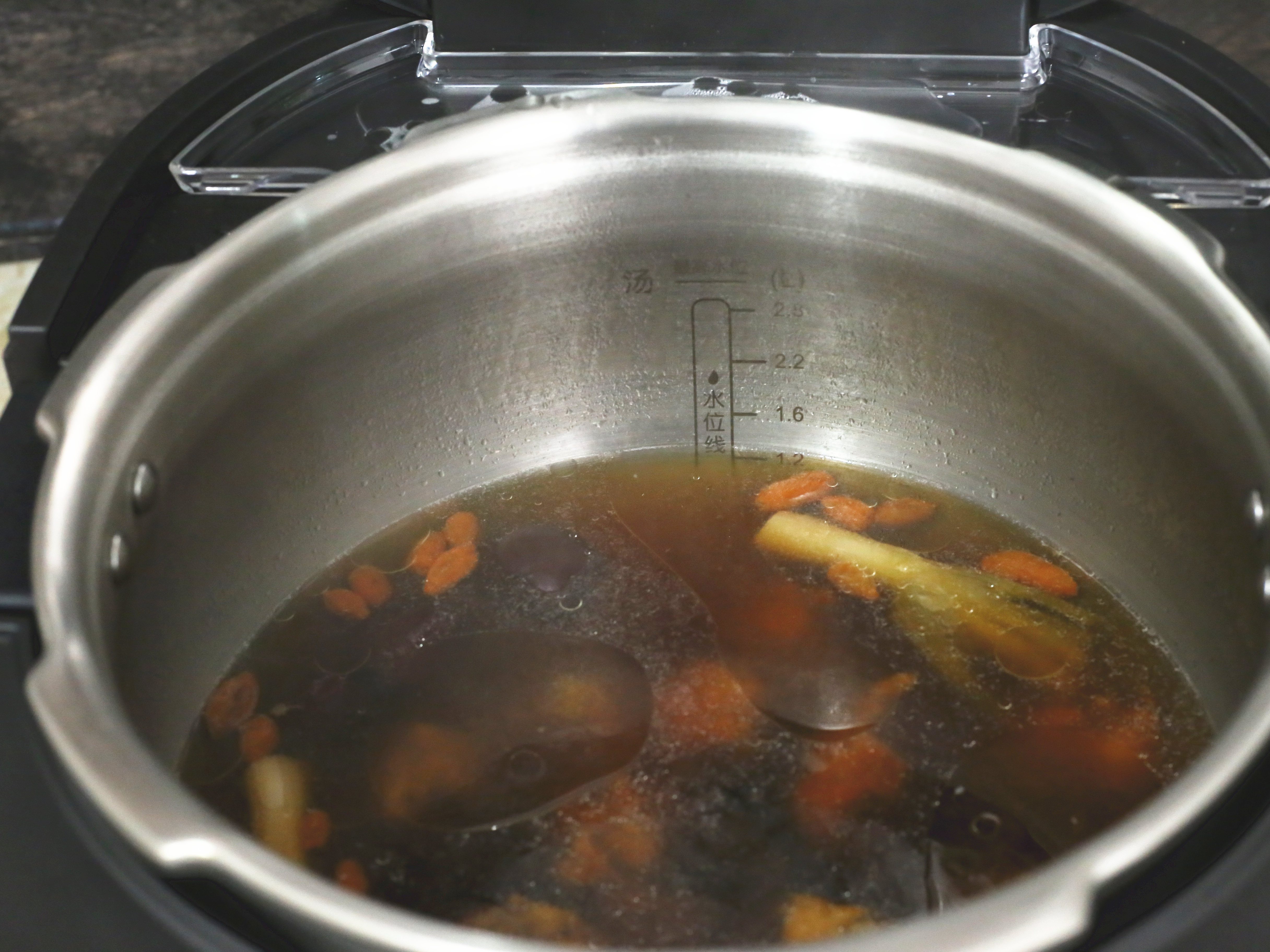 4.程序結束后開鍋,可以看到水位變成1.2,湯更濃郁了,加入調味,攪拌幾下。