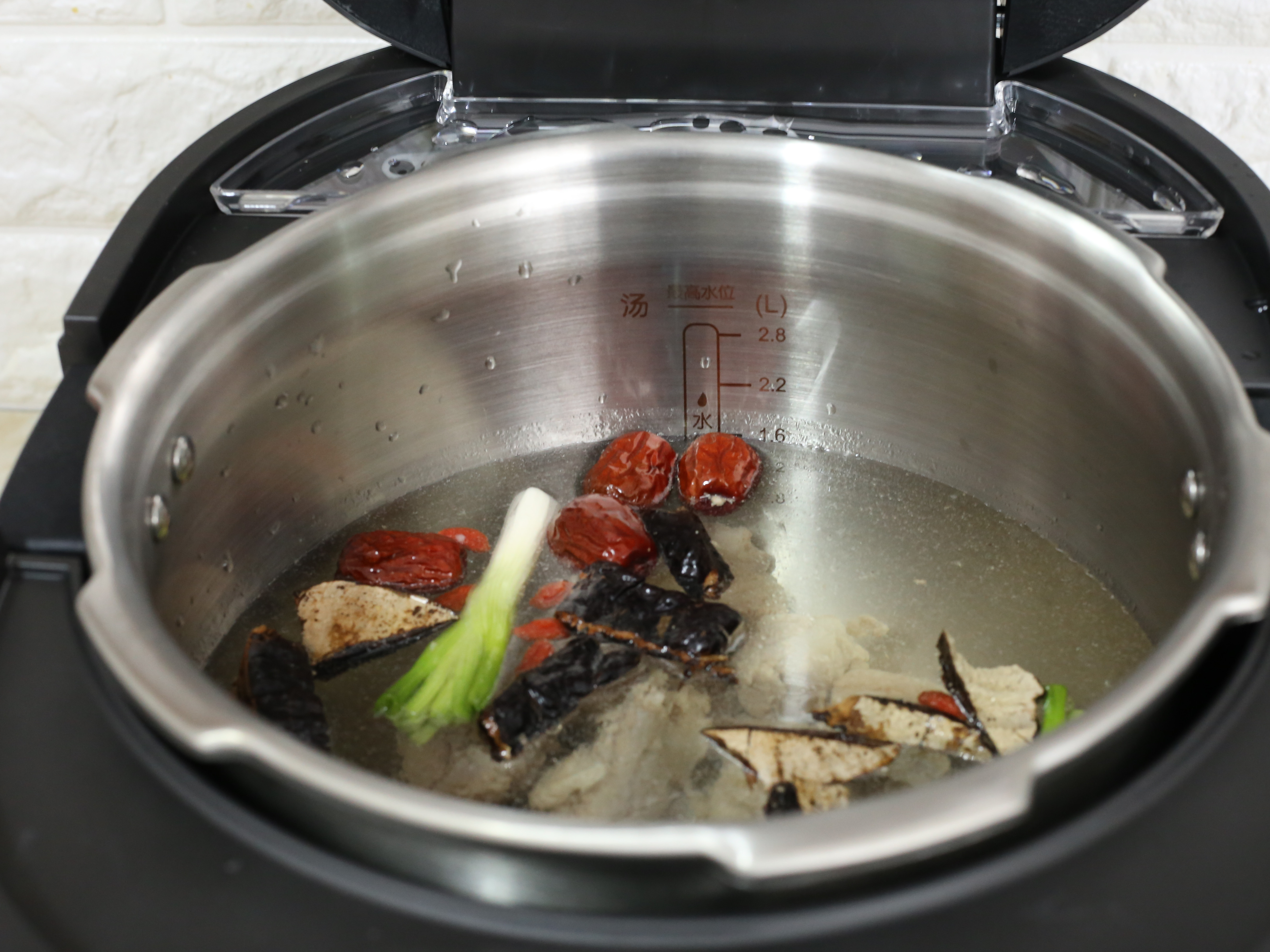 2.排骨,靈芝,紅棗枸杞和蔥頭放入蘇泊爾電壓力鍋的不銹鋼鍋中,加水至1.6刻度。