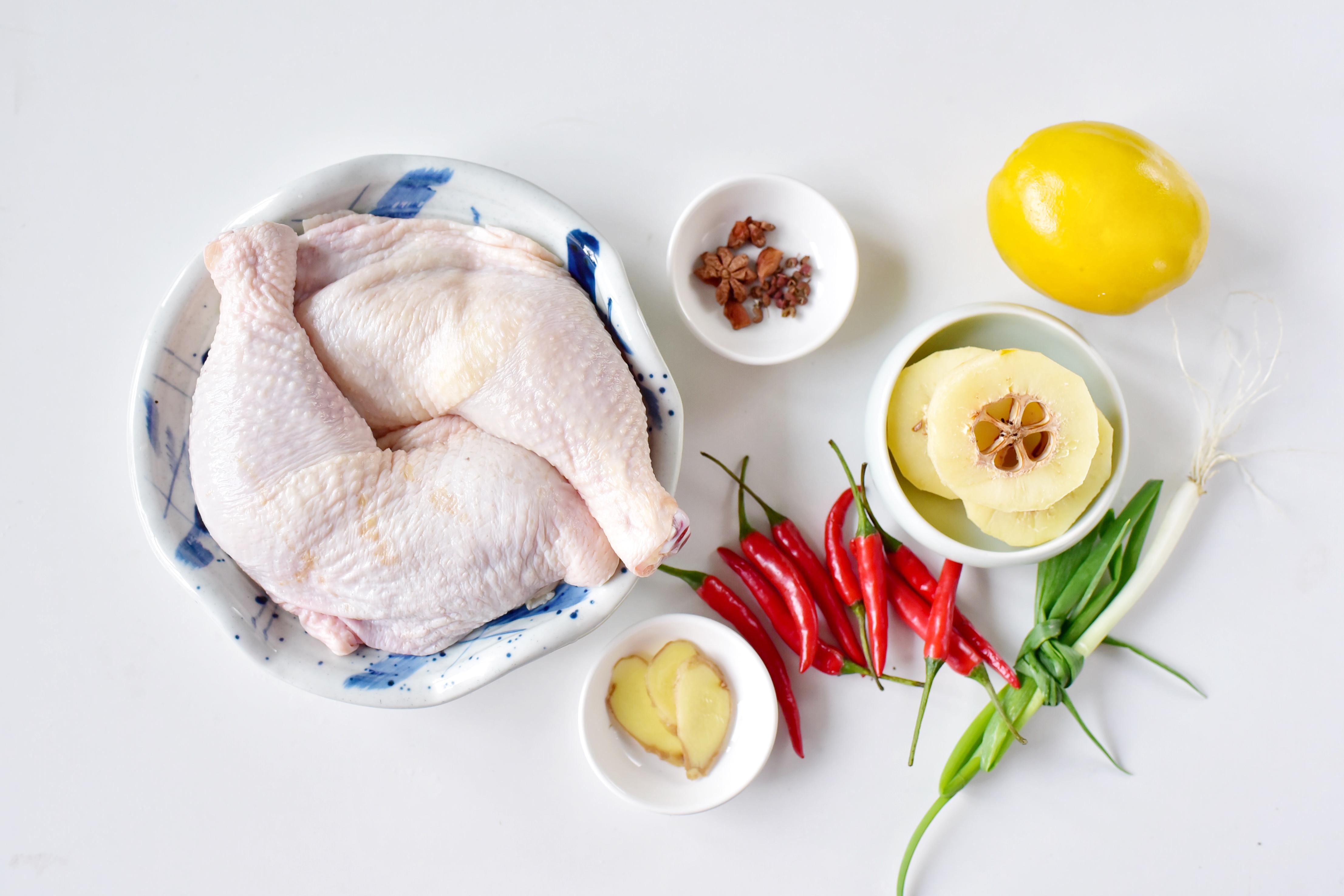 2雞腿、酸木瓜放入高壓鍋中,姜、花椒、八角放入料包中一同放入鍋內。