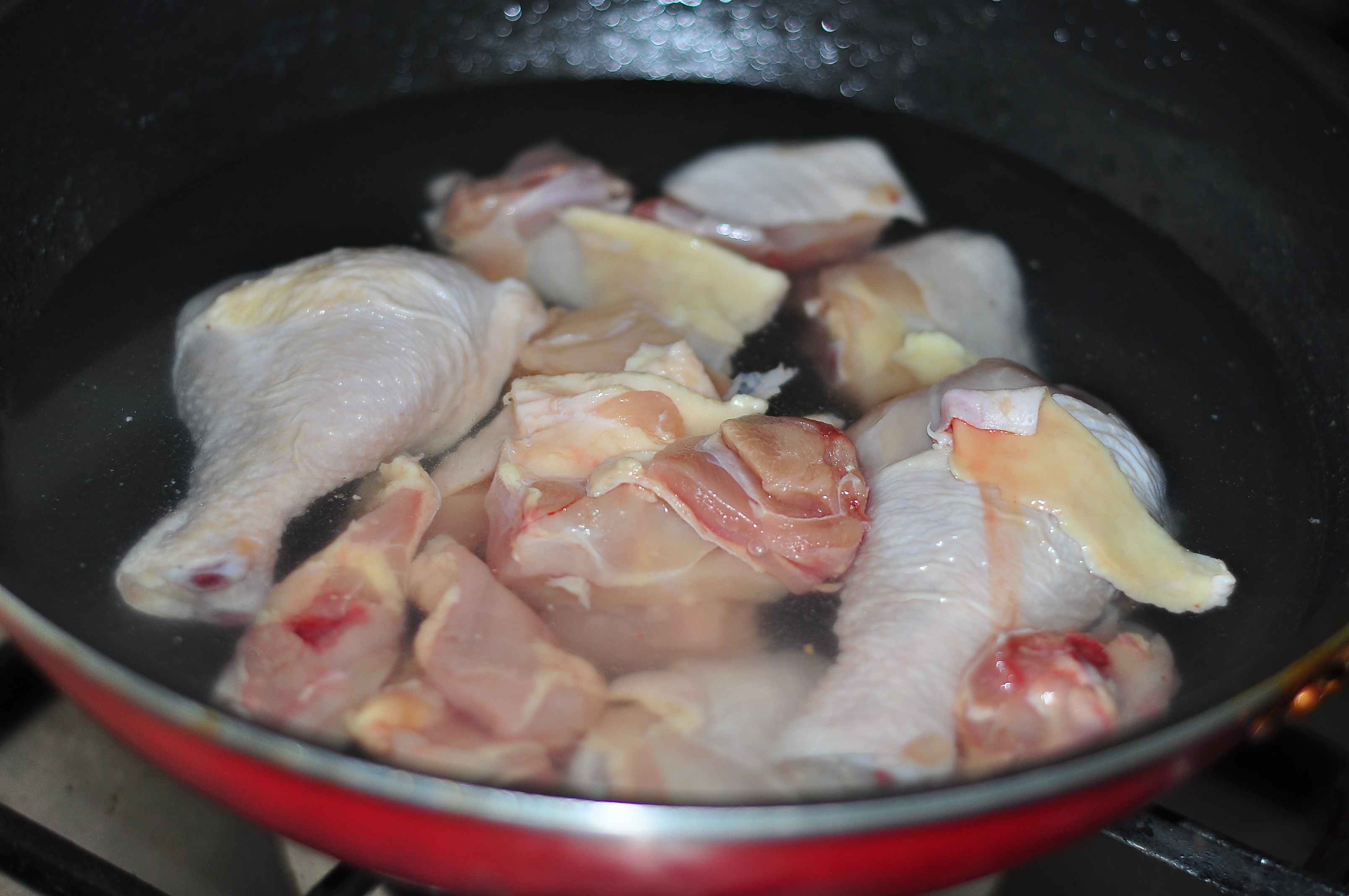 1將酸木瓜去皮切片備用,雞腿洗凈切塊,冷水下鍋焯燙,水開撇去浮沫撈出沖洗。